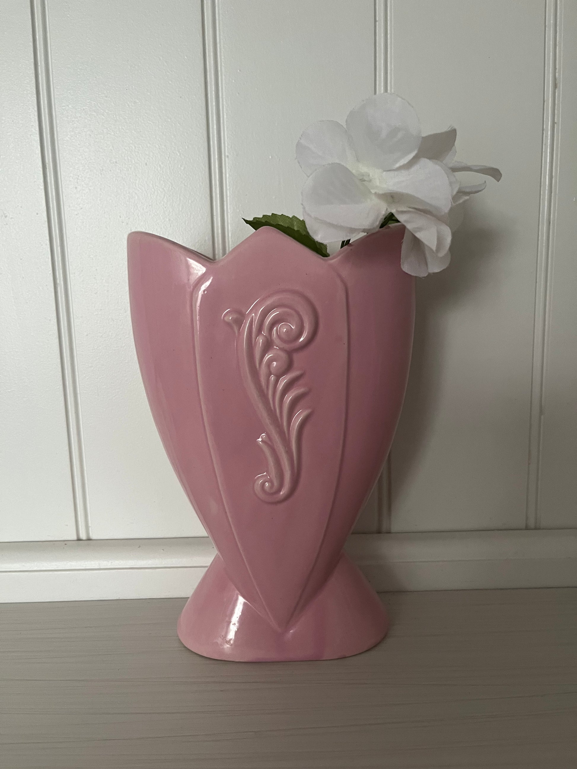 1940s Vintage Art Deco Fredericksburg Pottery Fan Vase in Pink Ceramic with Floral Design