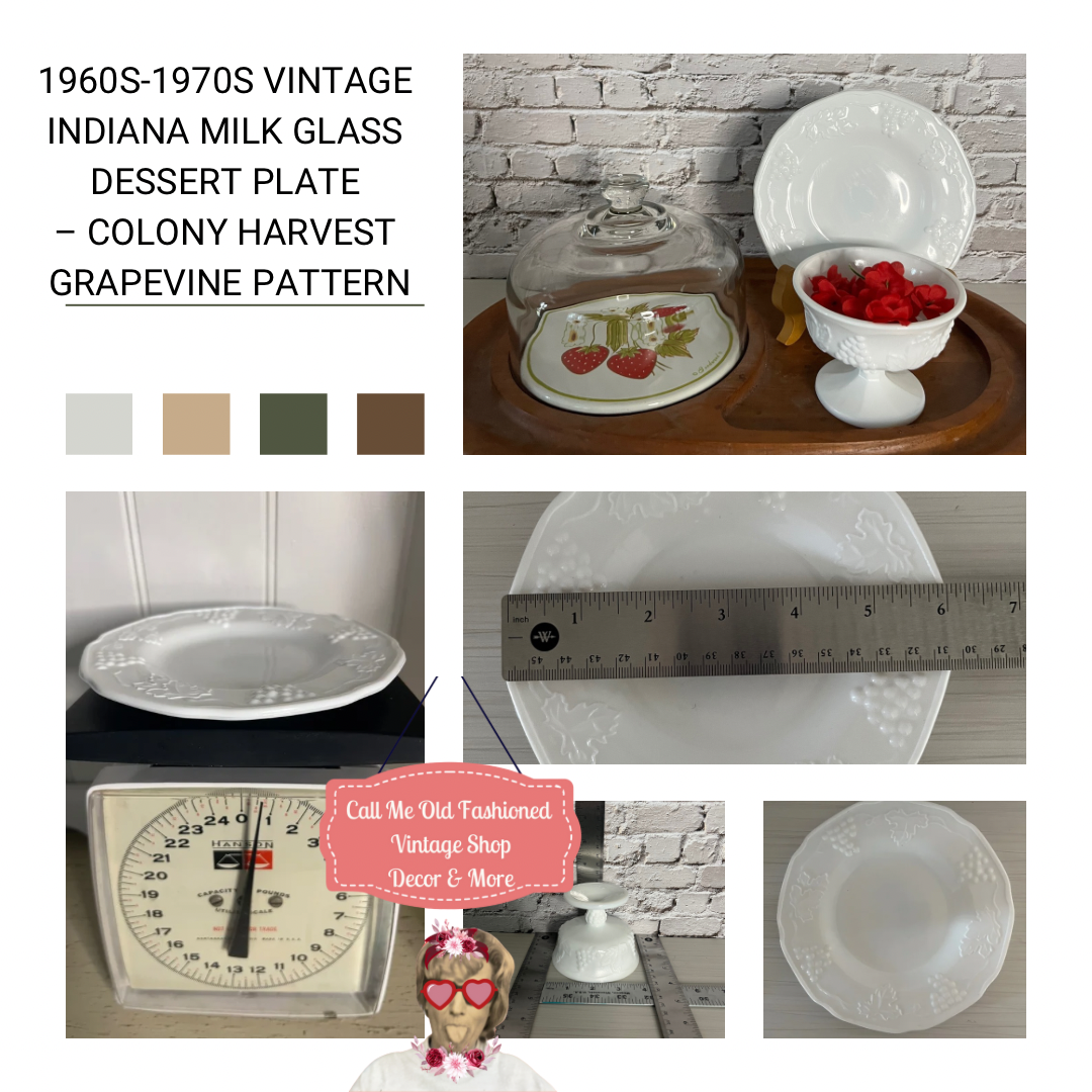 Indiana Glass Company was a major producer of milk glass and pressed glassware from the early 1900s to the late 20th century. Their Colony Harvest pattern, featuring grape clusters and vines, was inspired by early European glass designs and became a staple in American homes from the 1950s through the 1980s. These pieces were often found in department stores, giveaways, and glassware sets, making them a popular collectible for vintage lovers today.