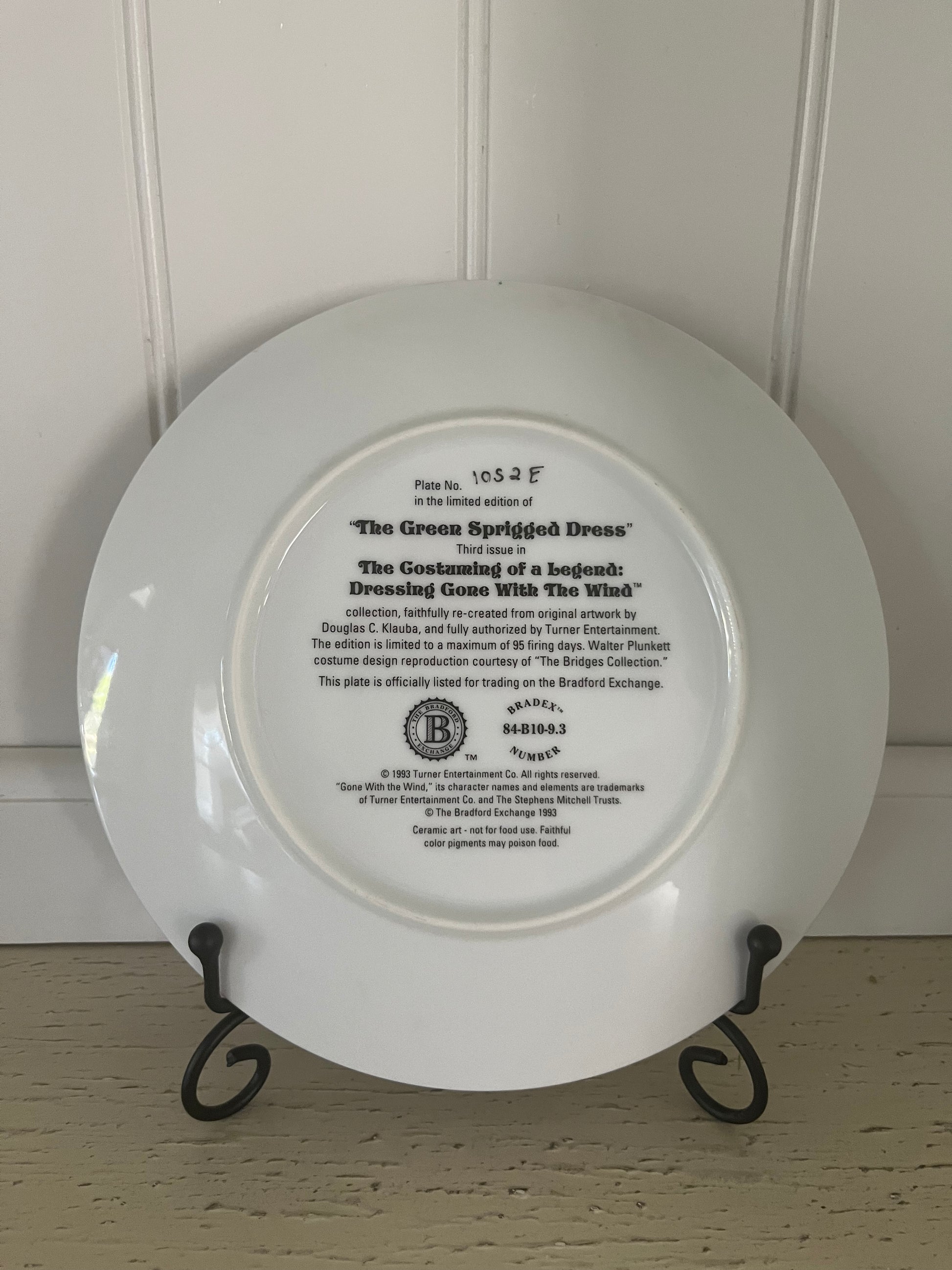 This 1993 collector plate, The Green Sprigged Dress, is the third issue in The Costuming of a Legend: Dressing Gone With the Wind™ series by The Bradford Exchange. Featuring Scarlett O’Hara in her iconic green sprigged gown, the artwork captures the elegance, drama, and layered social symbolism of one of cinema’s most legendary costumes. Finished with a delicate gold rim and faithfully reproduced from original artwork by Douglas C. Klauba, this decorative ceramic plate was produced in a limited edition run and is officially listed for trading on the Bradford Exchange. A timeless piece for classic film lovers, Southern Gothic décor enthusiasts, and collectors of Hollywood costume history.