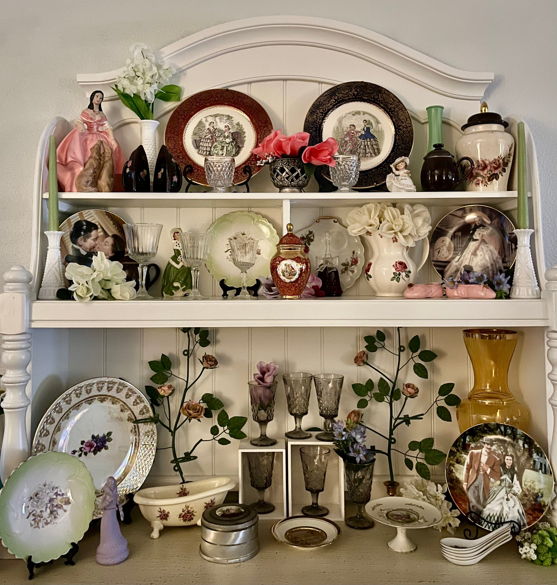 • Feminine vintage vignette shelf styling