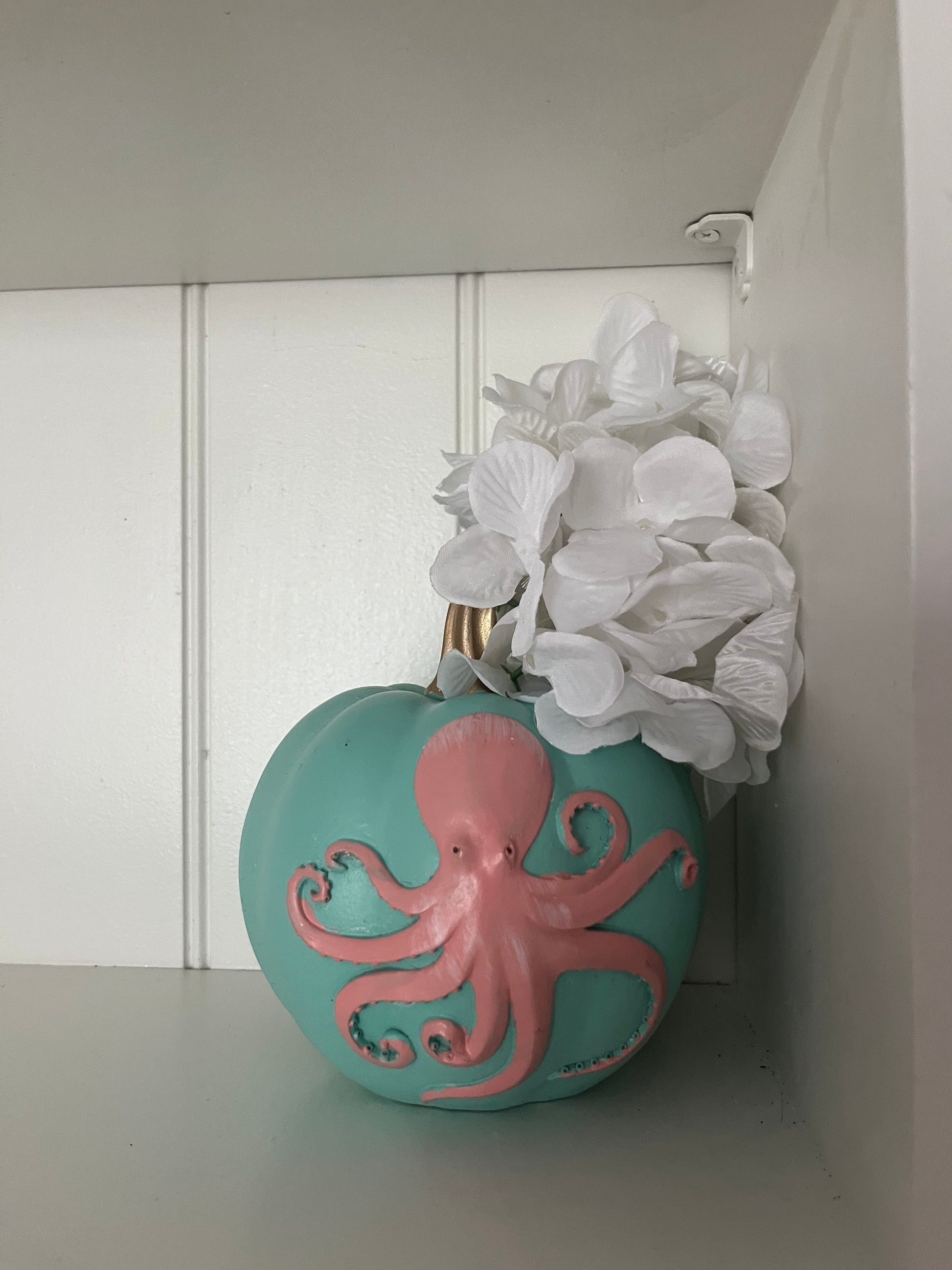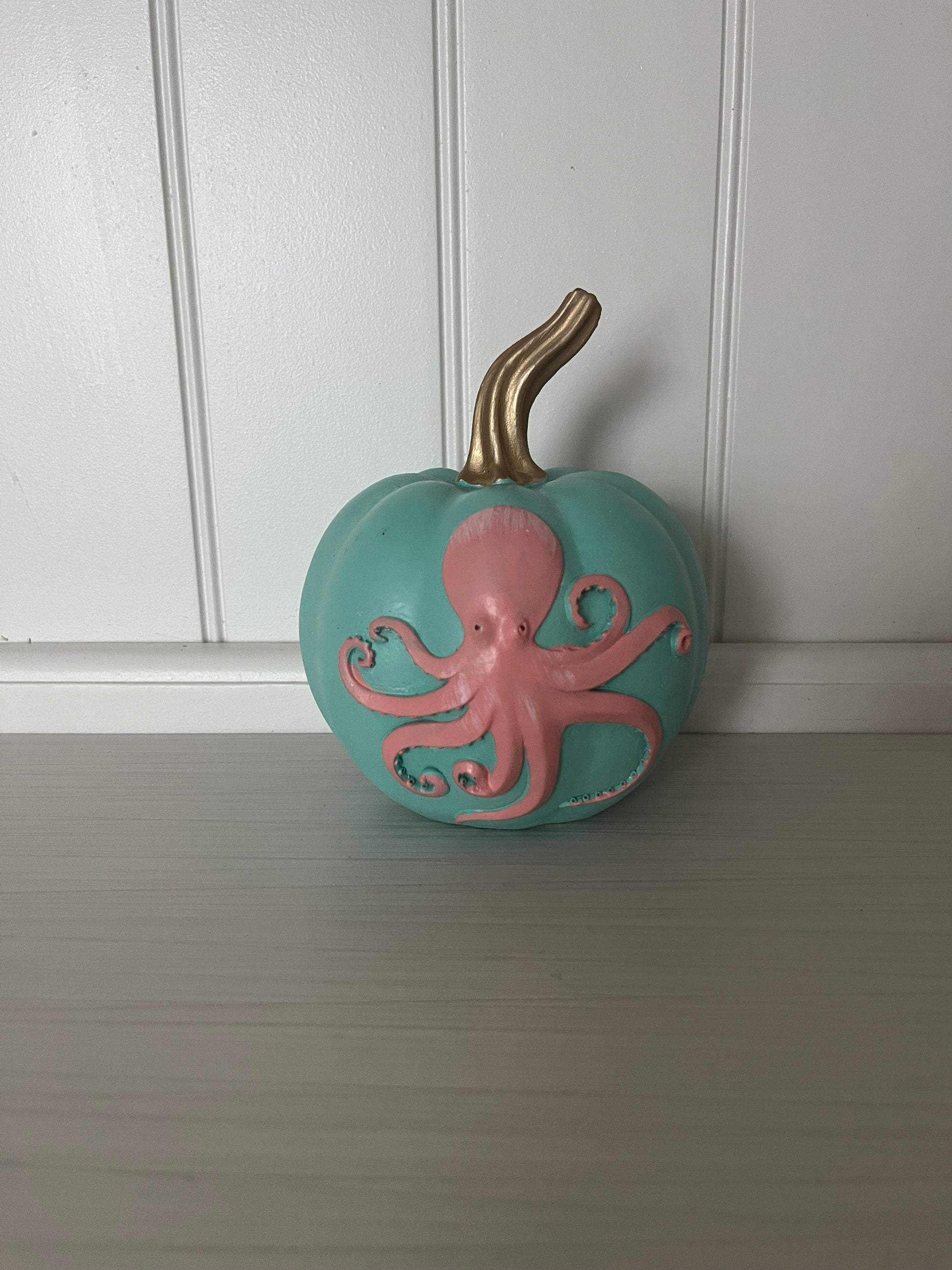 Add a splash of seaside whimsy to your seasonal décor with this hand-painted aqua pumpkin featuring a sculpted pink octopus and shimmering gold stem. The unique blend of coastal and Halloween charm makes it a perfect centerpiece for nautical autumn displays, beach house décor, or under-the-sea themed vignettes. Lightweight yet detailed, it fits beautifully into pastel or boho color palettes while adding a dash of quirky character.