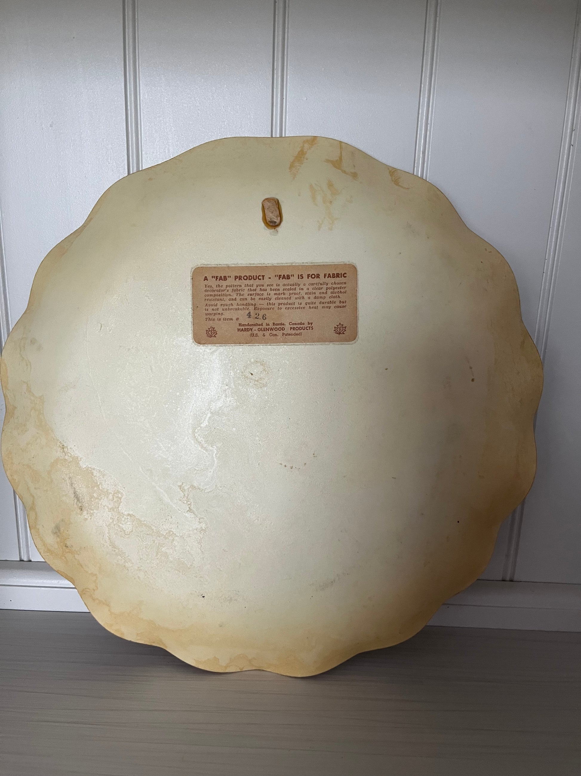 Mid-Century “FAB” Floral Wall Plate by Hardy-Glenwood – Large 13.5” Resin & Fabric Art Plate – 1950s–1960s Vintage Canada