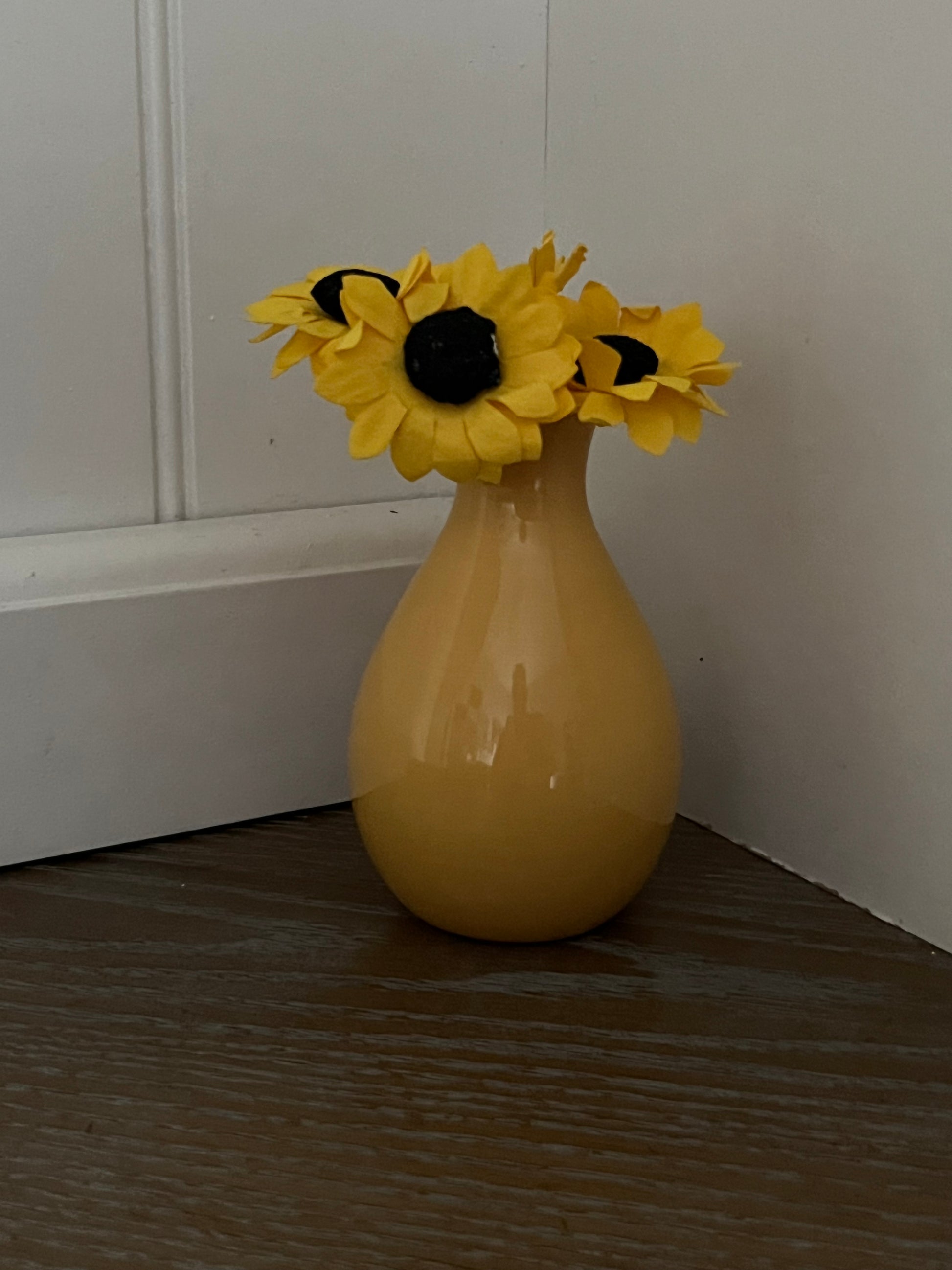 This cheerful mustard yellow ceramic bud vase features a rounded teardrop silhouette with a smooth glossy glaze and the word “LAUGH” embossed on its front. Standing approximately 4 inches tall x 2 1/2” and weighing 3.6 oz, it’s a perfect little accent for a sunny shelf, bathroom vanity, or small floral display.