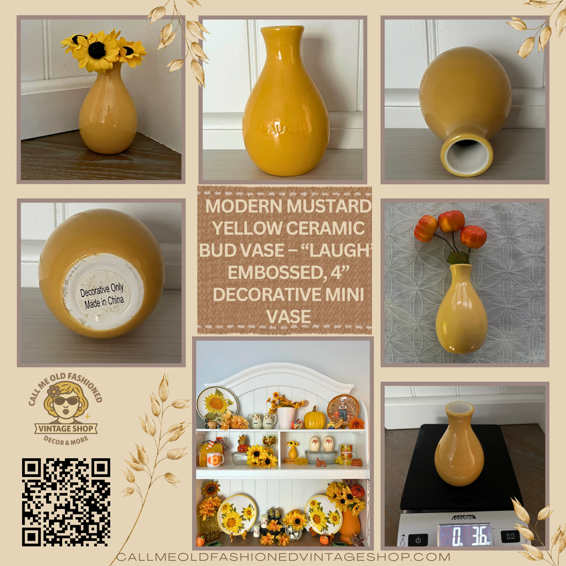 Modern Mustard Yellow Ceramic Bud Vase – “Laugh” Embossed, 4” Decorative Mini Vase