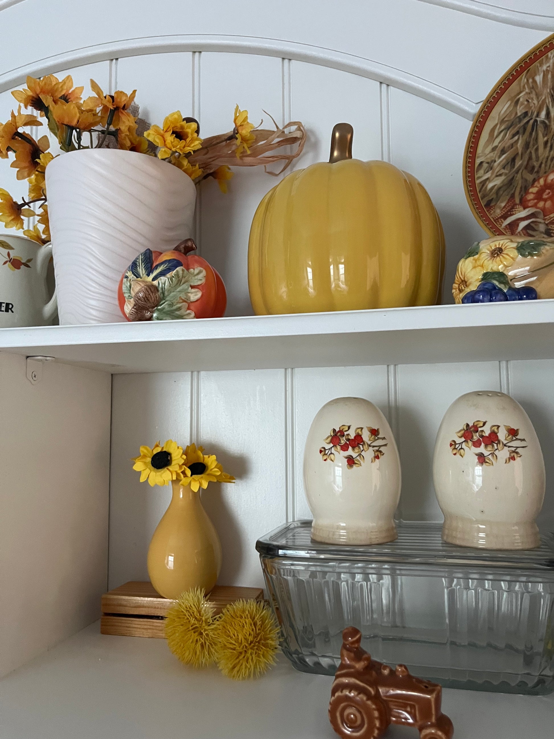 Ceramic pumpkins became a popular alternative to real gourds in the mid-to-late 20th century, when seasonal décor trends shifted toward reusable, color-coordinated displays. This piece reflects the modern minimalist and gold-accented trend that gained momentum in the 2010s, emphasizing a more curated autumn aesthetic rather than rustic harvest themes.