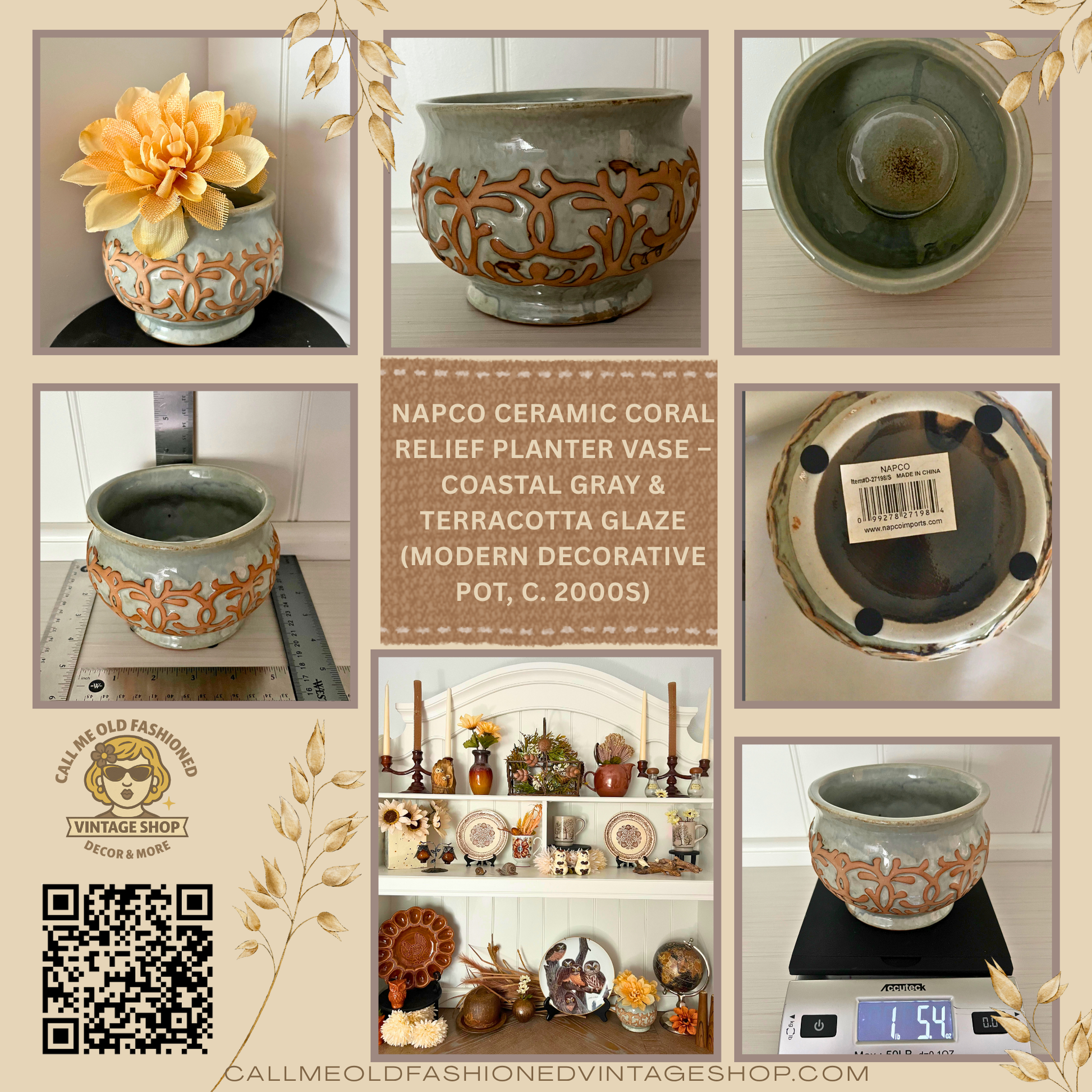 NAPCO Ceramic Coral Relief Planter Vase – Coastal Gray & Terracotta Glaze (Modern Decorative Pot, c. 2000s)