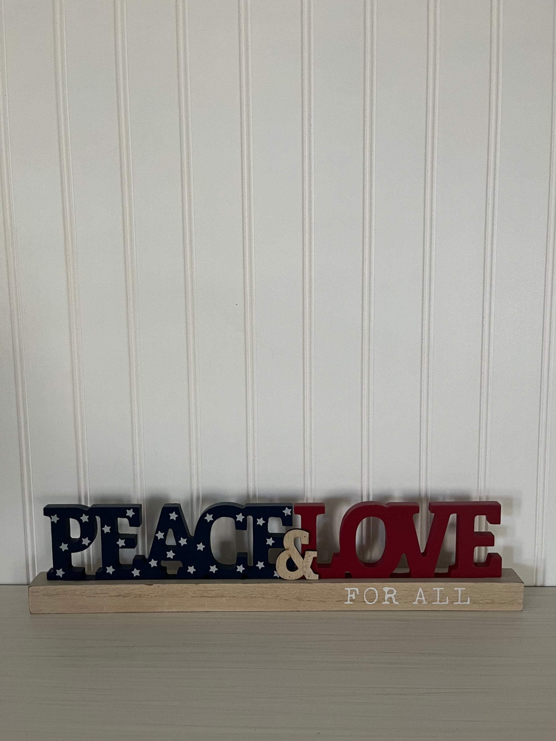 This is for a charming Red White & Blue Peace & Love Sign, measuring approximately 17”x 3” and weighing 9 oz. Perfect for adding a touch of retro decor and patriotic flair to any space, this sign embodies the spirit of peace and love with its vibrant colors and vintage charm.