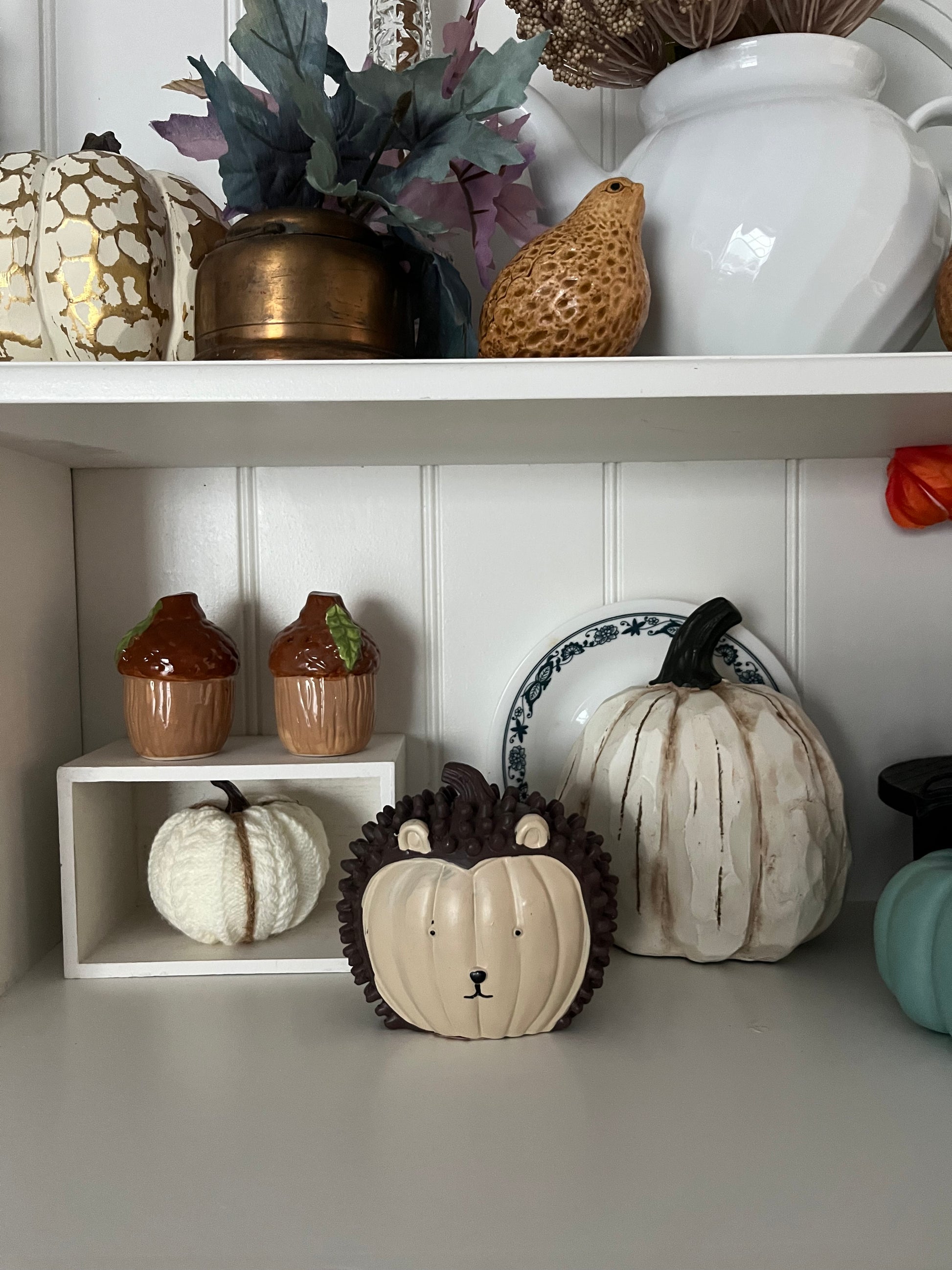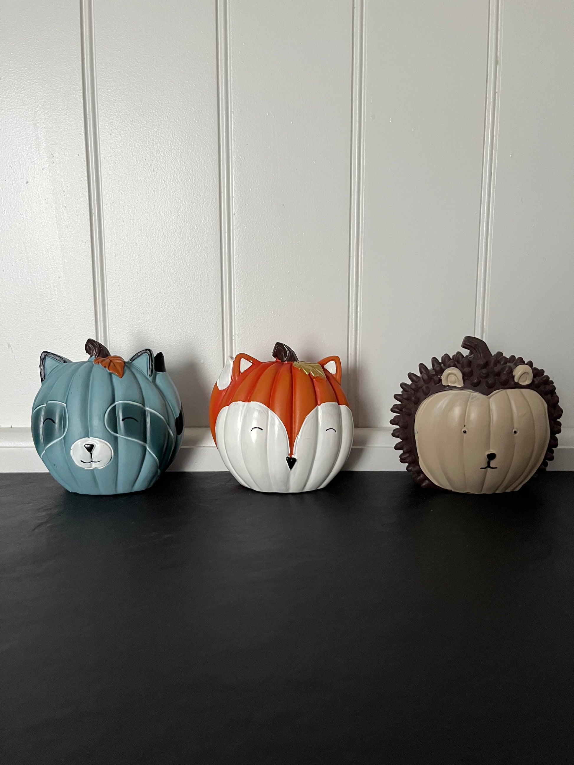 Set of 3 Woodland Animal Pumpkin Figurines – Raccoon, Fox & Hedgehog, Hand-Painted Fall Decor