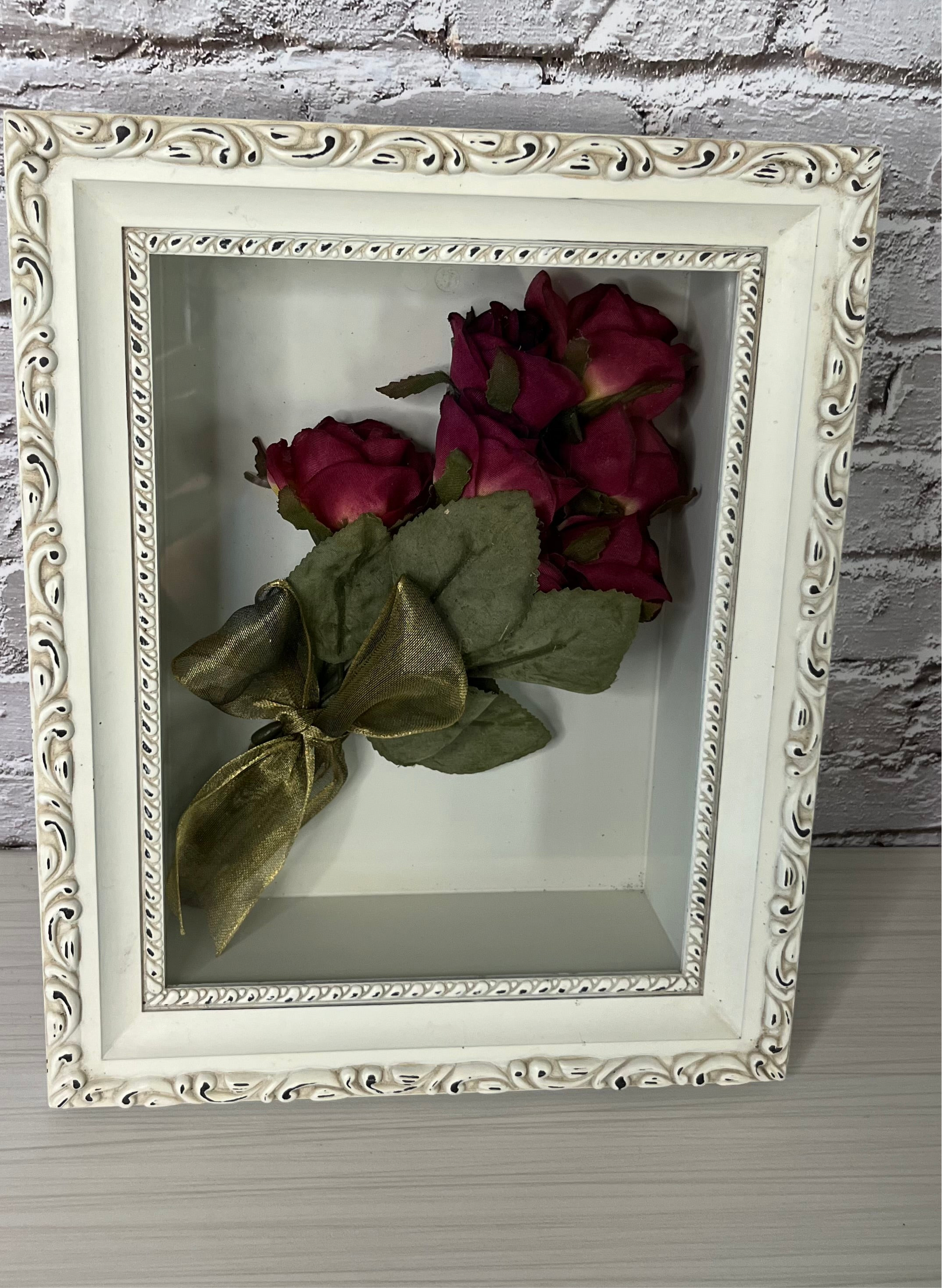Capture the essence of romantic nostalgia with this vintage shadow box, featuring Silk deep burgundy roses, elegantly tied with an olive green ribbon. Encased in an ornate ivory shadow box frame, this piece blends Victorian charm with French Rococo elegance. The detailed scrolling along the frame evokes 19th-century craftsmanship, making it an exquisite addition to romantic, shabby chic, or vintage-inspired décor.
