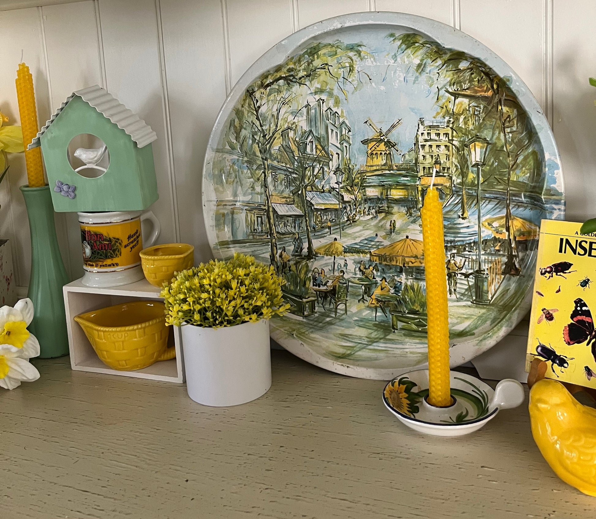 Transport your space to European charm with this preloved Daher Decorated Ware Tin Tray from 1971. Featuring a quaint windmill and bustling street cafes and shops, this piece adds a touch of nostalgia and character to any room. Made in England, it exudes craftsmanship and vintage allure. Approx 16” diameter.