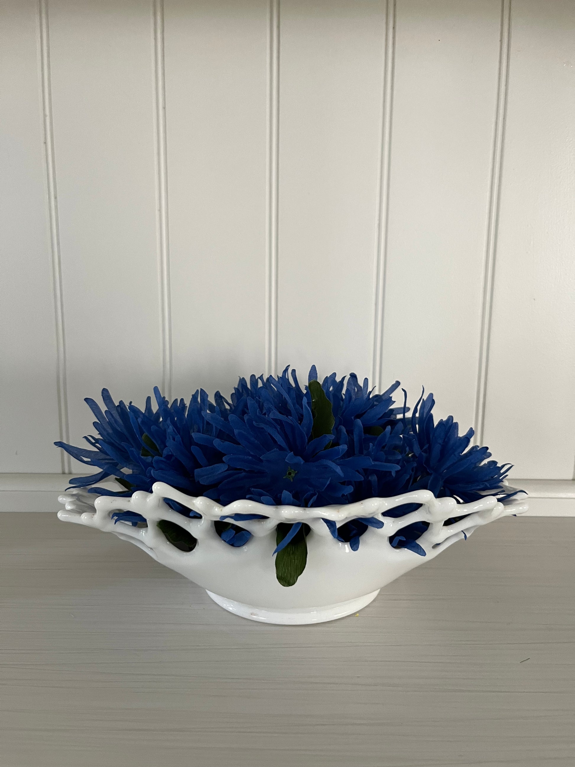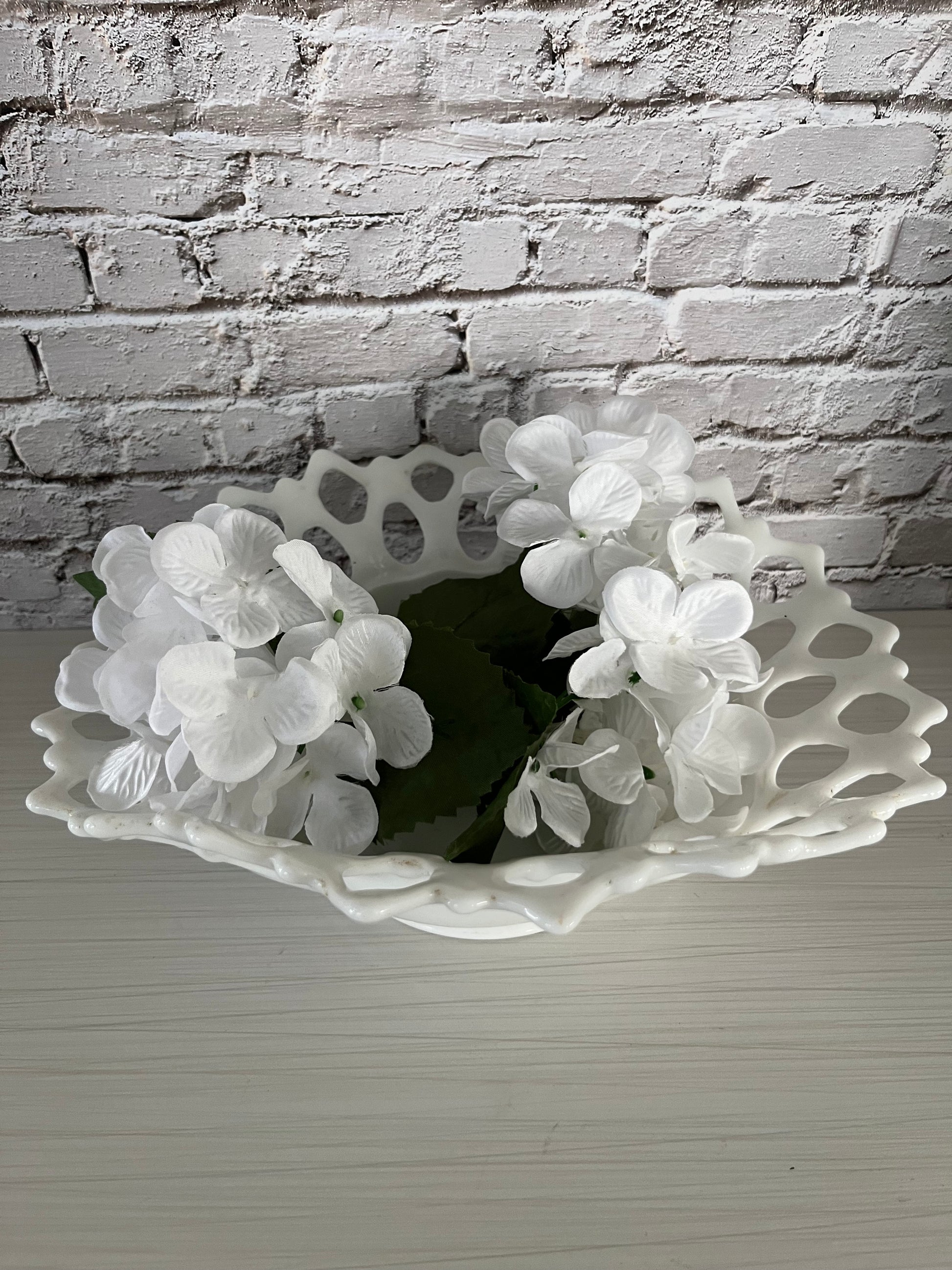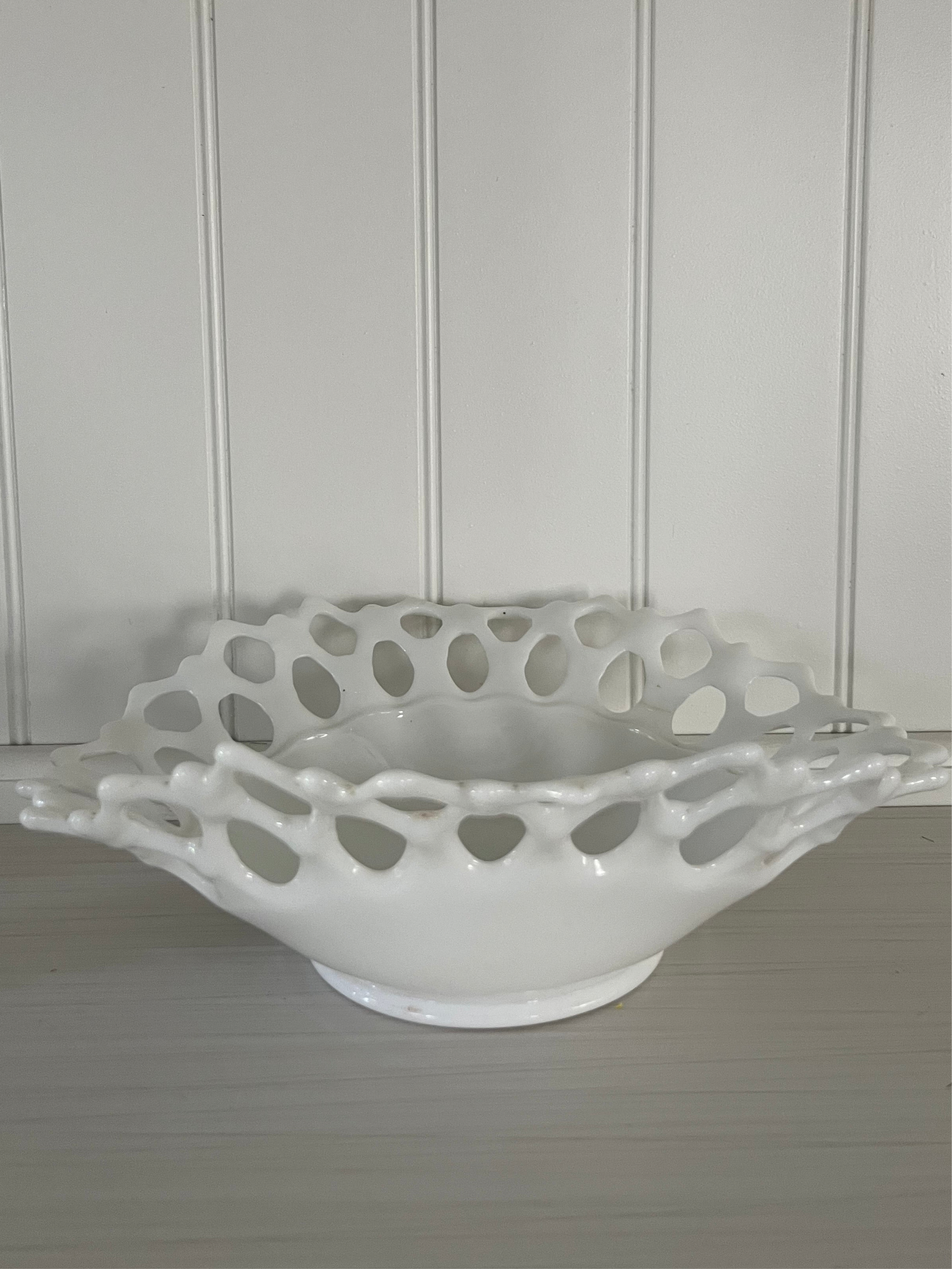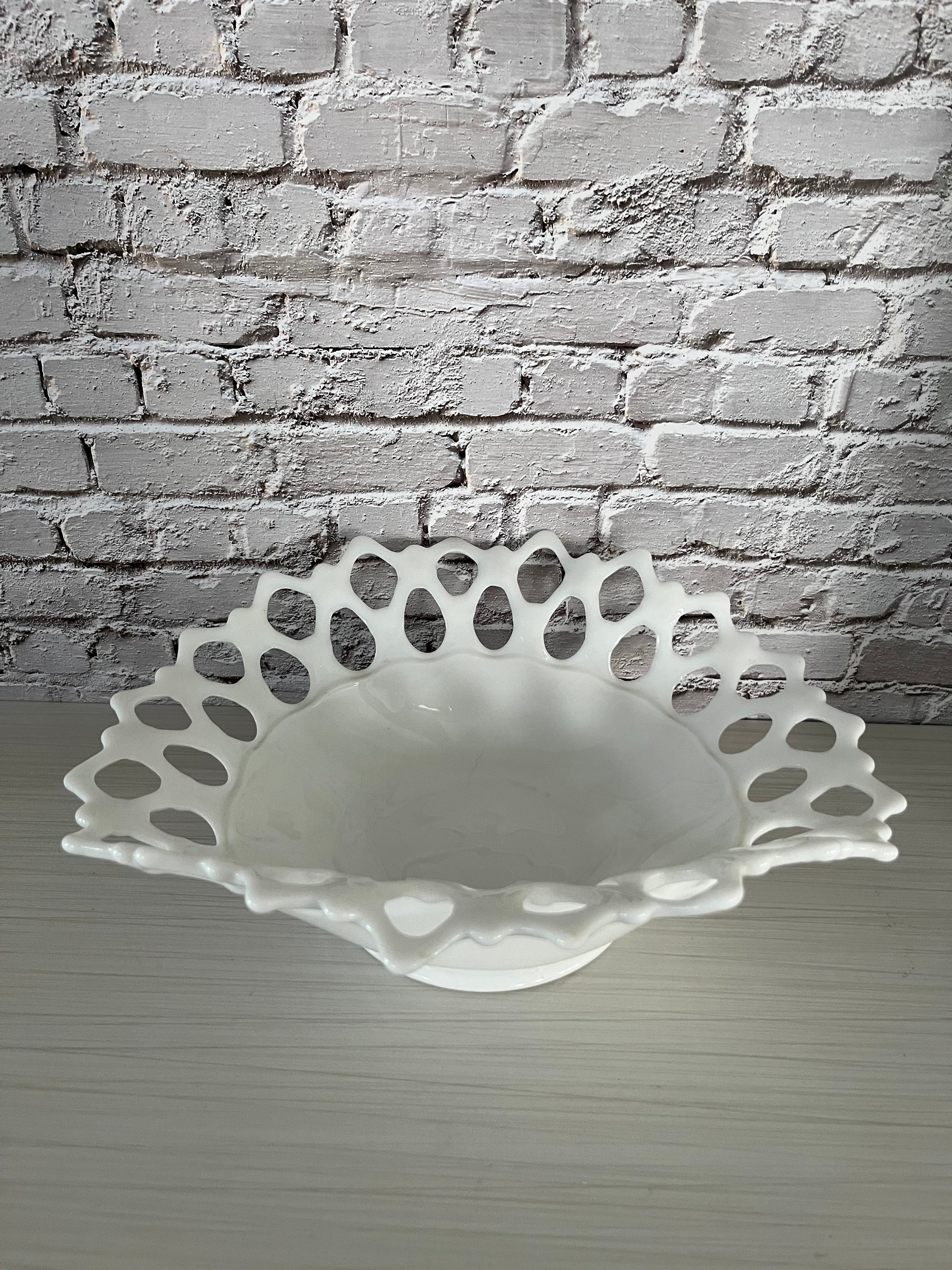 Milk glass has been popular since the Victorian era (late 1800s), but it saw a huge revival during the mid-20th century (1940s–1960s) when companies like Fenton, Westmoreland, and Indiana Glass produced open lace and hobnail designs. Lace-edge bowls like this one were often used as wedding gifts, centerpiece fruit bowls, or candy dishes. Their delicate reticulated rims were inspired by European porcelain, but rendered in sturdy American pressed glass. Collectors today prize these bowls for their blend of romantic style and everyday durability.