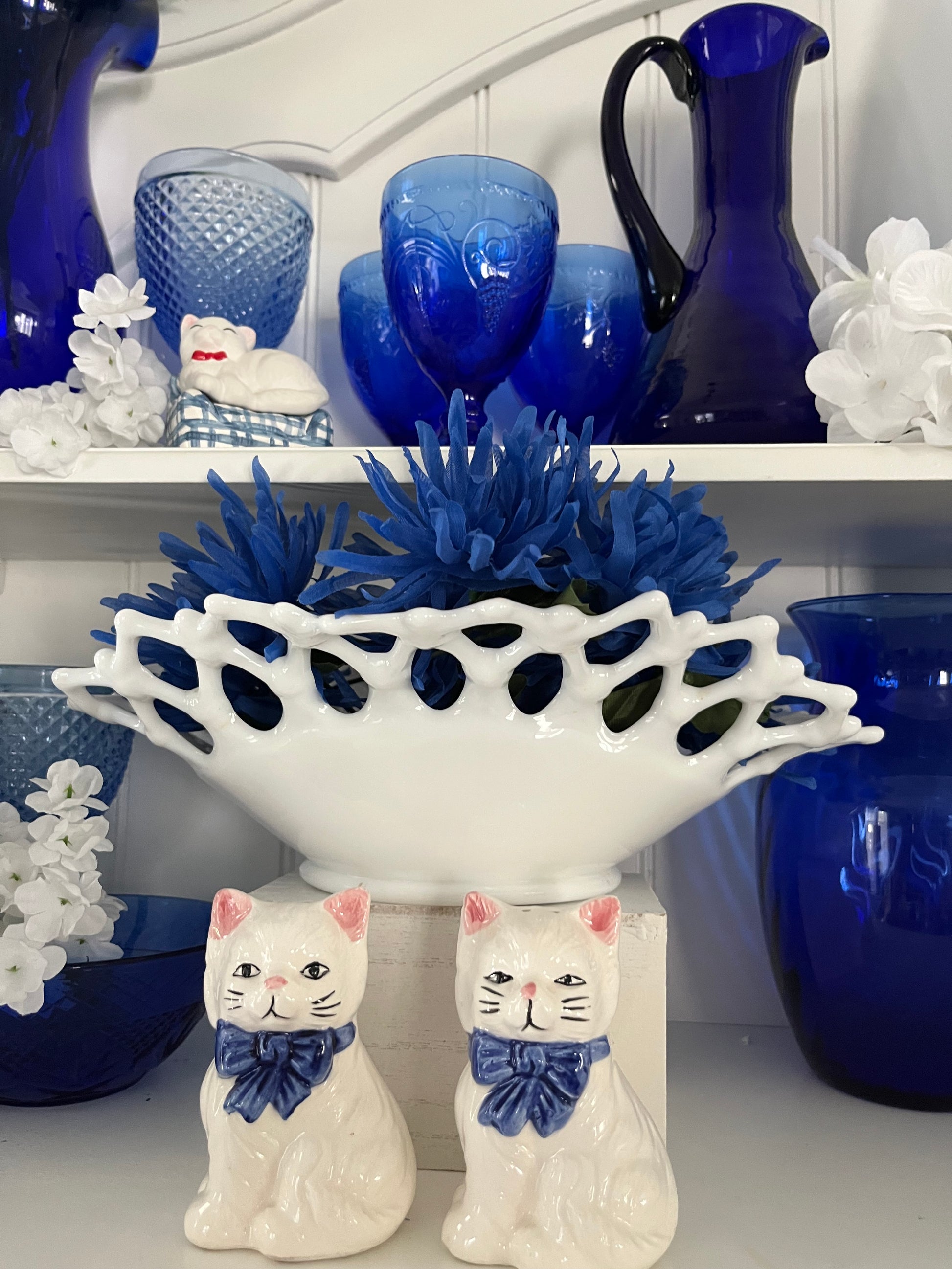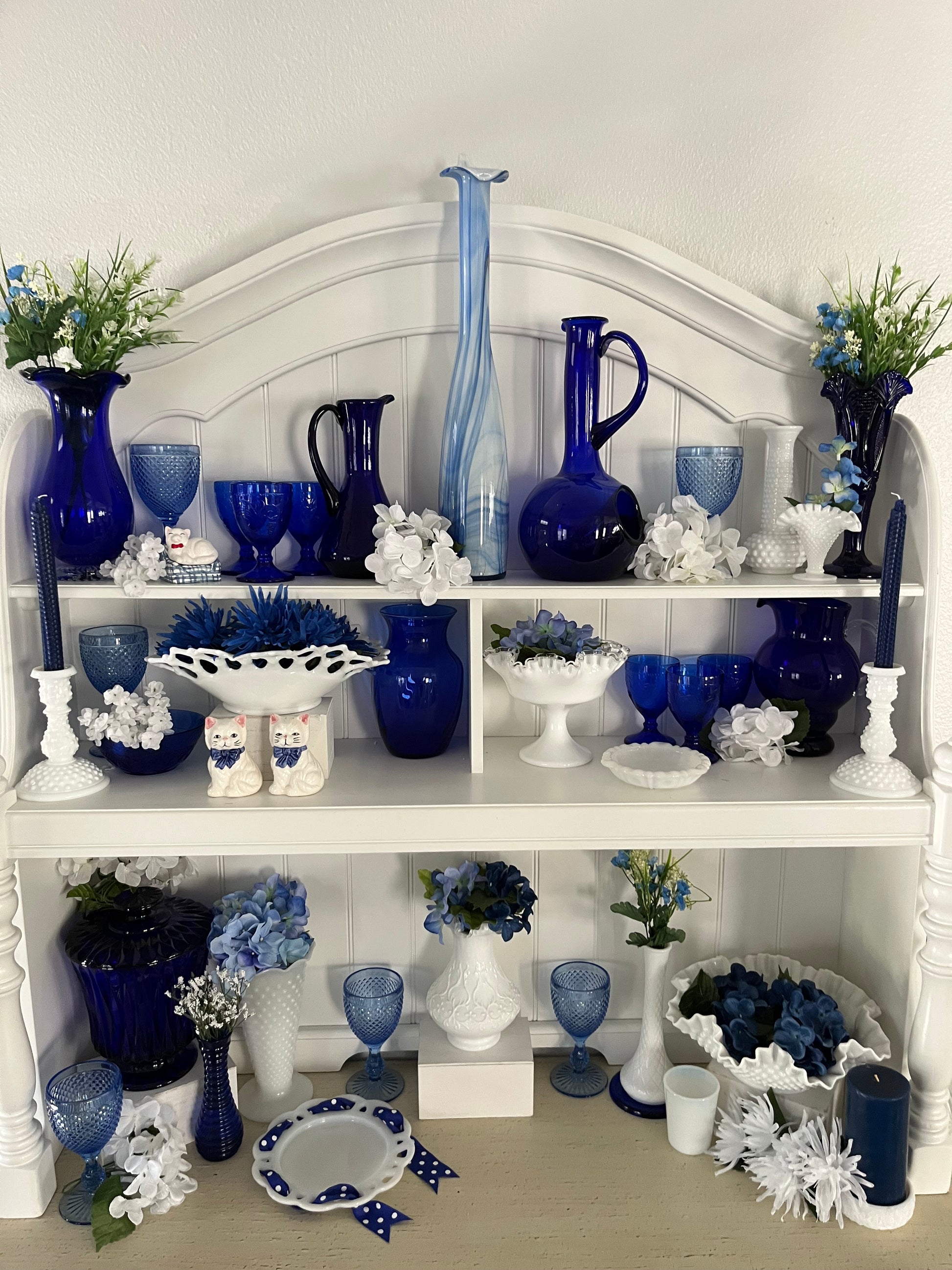 • Display with blue glassware for a classic coastal or cottage color pairing.
