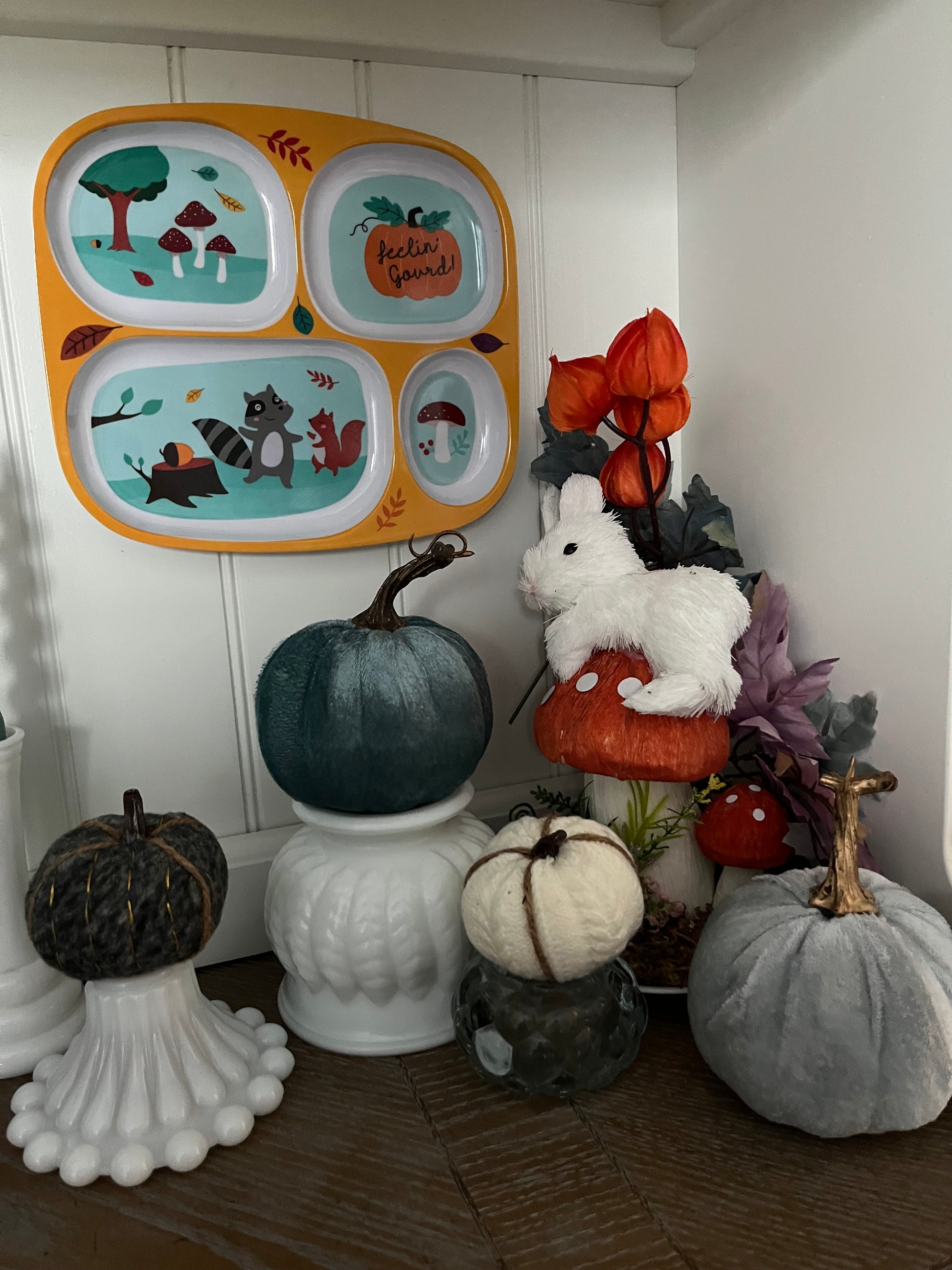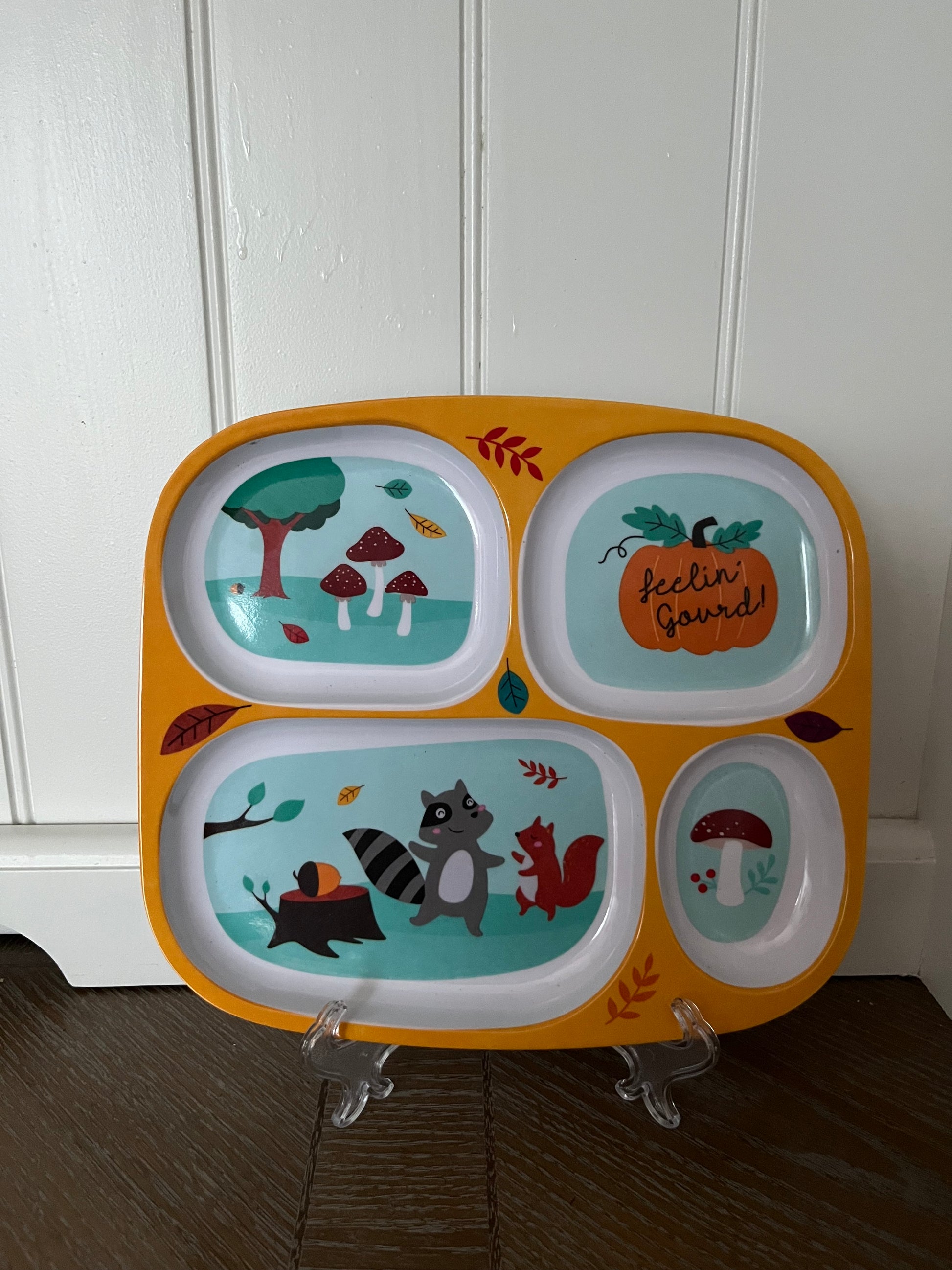 “Feelin’ Gourd!” Fall Woodland Animals Divided Plate – Raccoon & Squirrel Design (c. 2010s)