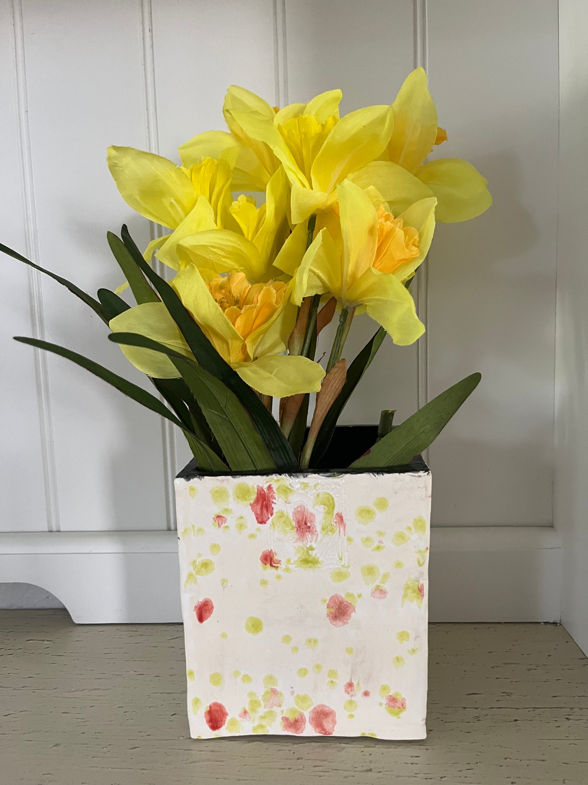 Created circa 1980s in the style of Shōzan Kiln (正山窯), the square vessel features thick, tactile clay walls and a glossy black interior. The outer glaze combines the crystalline chemistry of Mayco Crystalites “Peacock Eyes” with hand-applied color splatter, producing blooming blue-green crystals on one face and spontaneous coral, yellow, and charcoal speckles on the others.