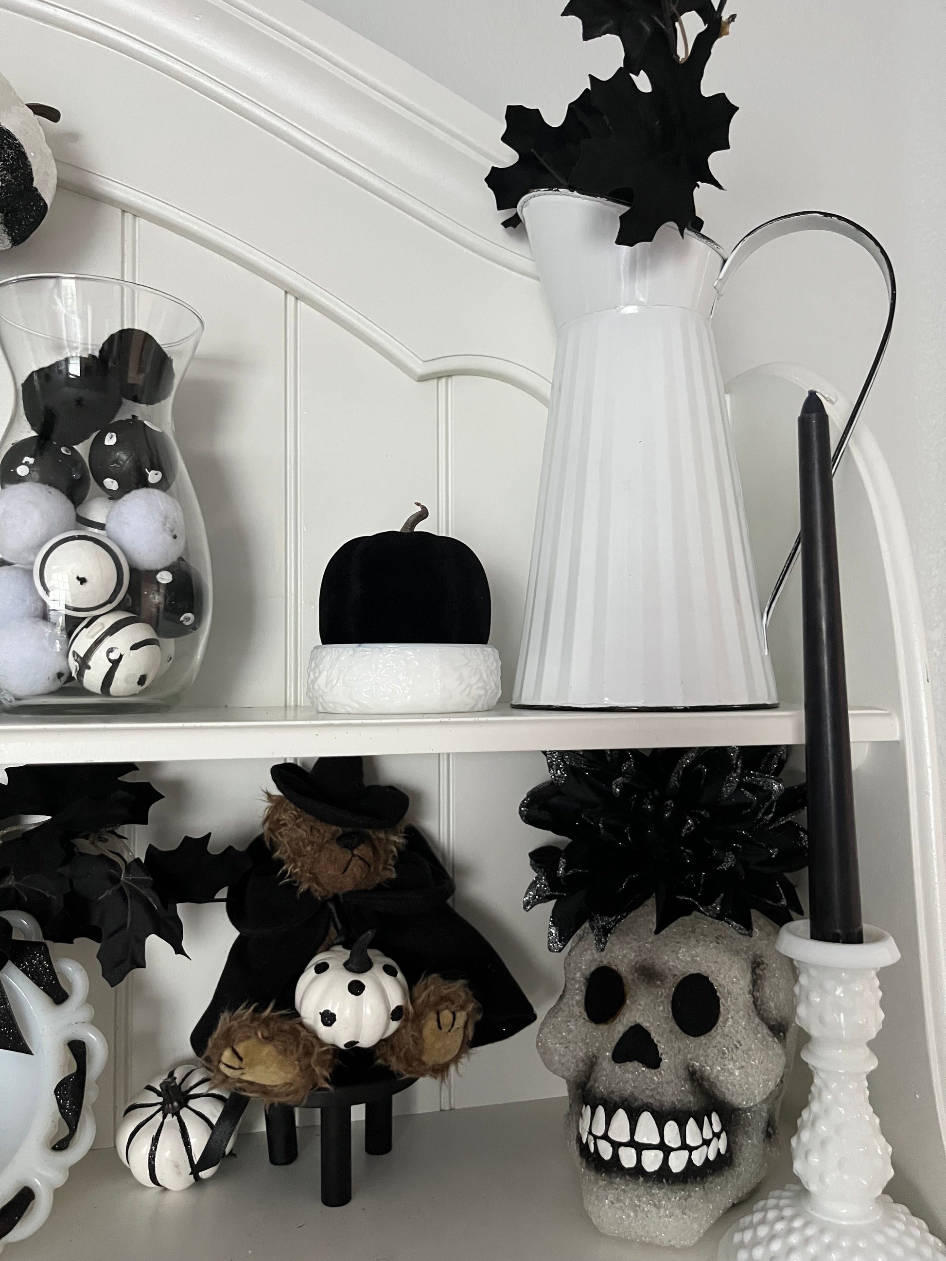 • Style on a bookshelf or mantle vignette with candles, spell books, and dried florals