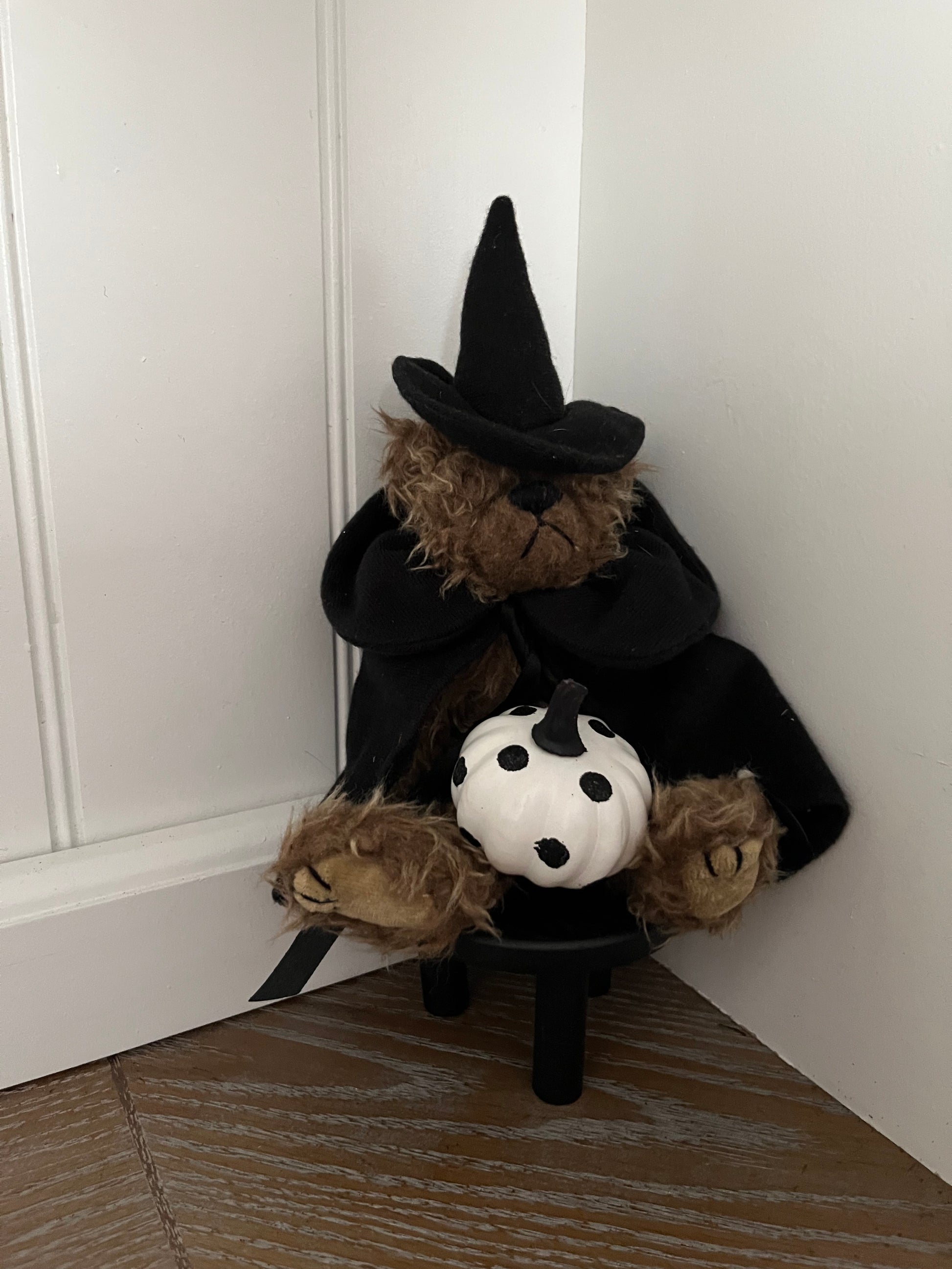 Meet Esmerelda, the enchanting plush bear from Ty’s beloved Attic Treasures collection (1993). Standing 10 inches tall, she dons a soft black witch’s hat and matching velvet cape tied with a satin bow — ready to charm both vintage collectors and Halloween enthusiasts alike. Her textured mocha-brown fur, jointed limbs, and soulful stitched expression embody the quaint, handmade aesthetic that made Ty’s early plush line so adored. Whether perched in a vignette, nestled among autumn décor, or starring in your Halloween hutch, Esmerelda is a bewitching addition to any vintage display