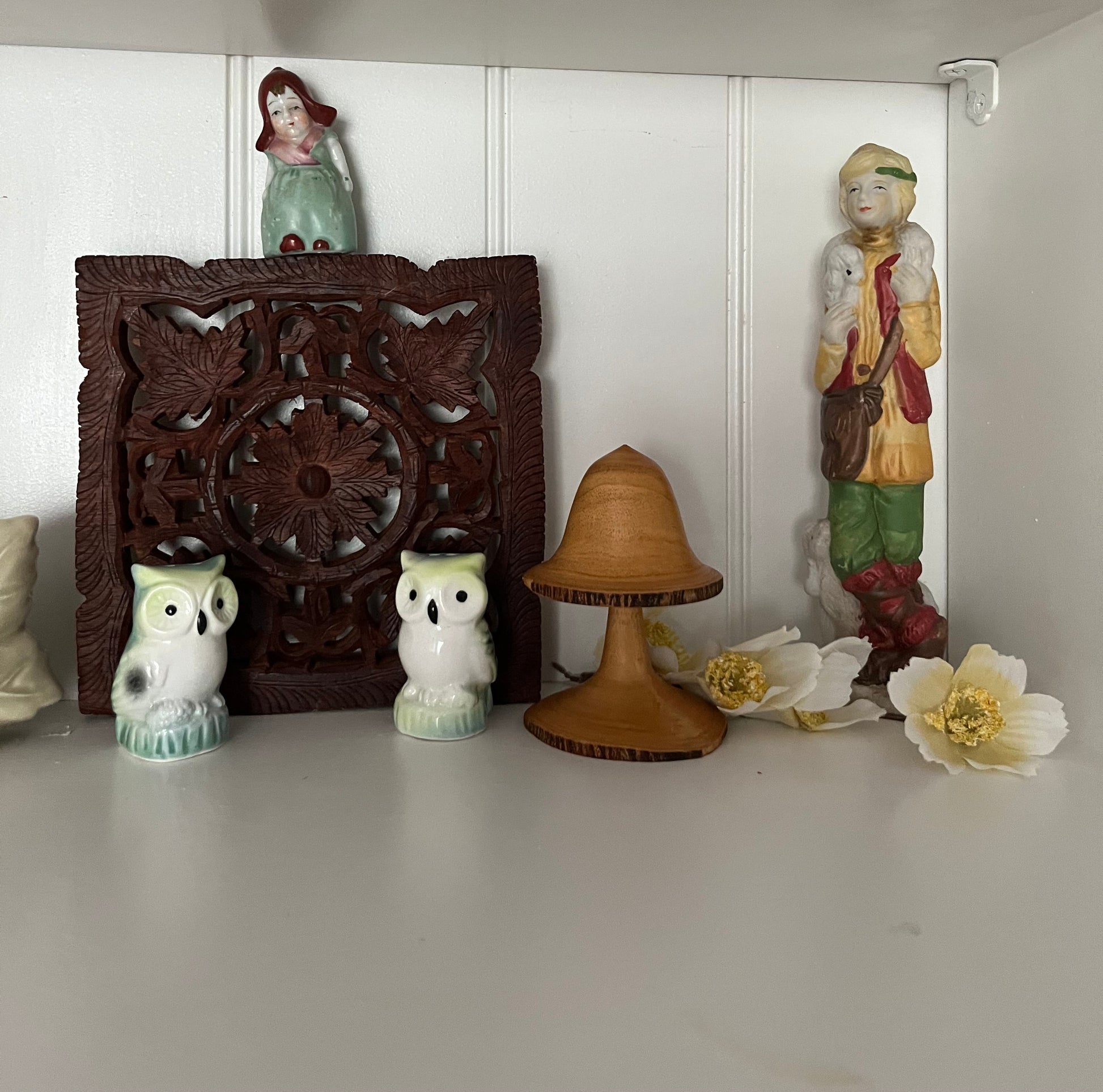Standing just over three inches tall, she’s the perfect little accent for a cottage-core vignette, nursery shelf, sewing nook, or windowsill display. The back of her bonnet shows several tiny holes that appear to be original to manufacture or a former functional use, adding even more character to this already whimsical piece. Display her alone or tuck her into a grouping of books, florals, and other small treasures for a sweet, old-world look.