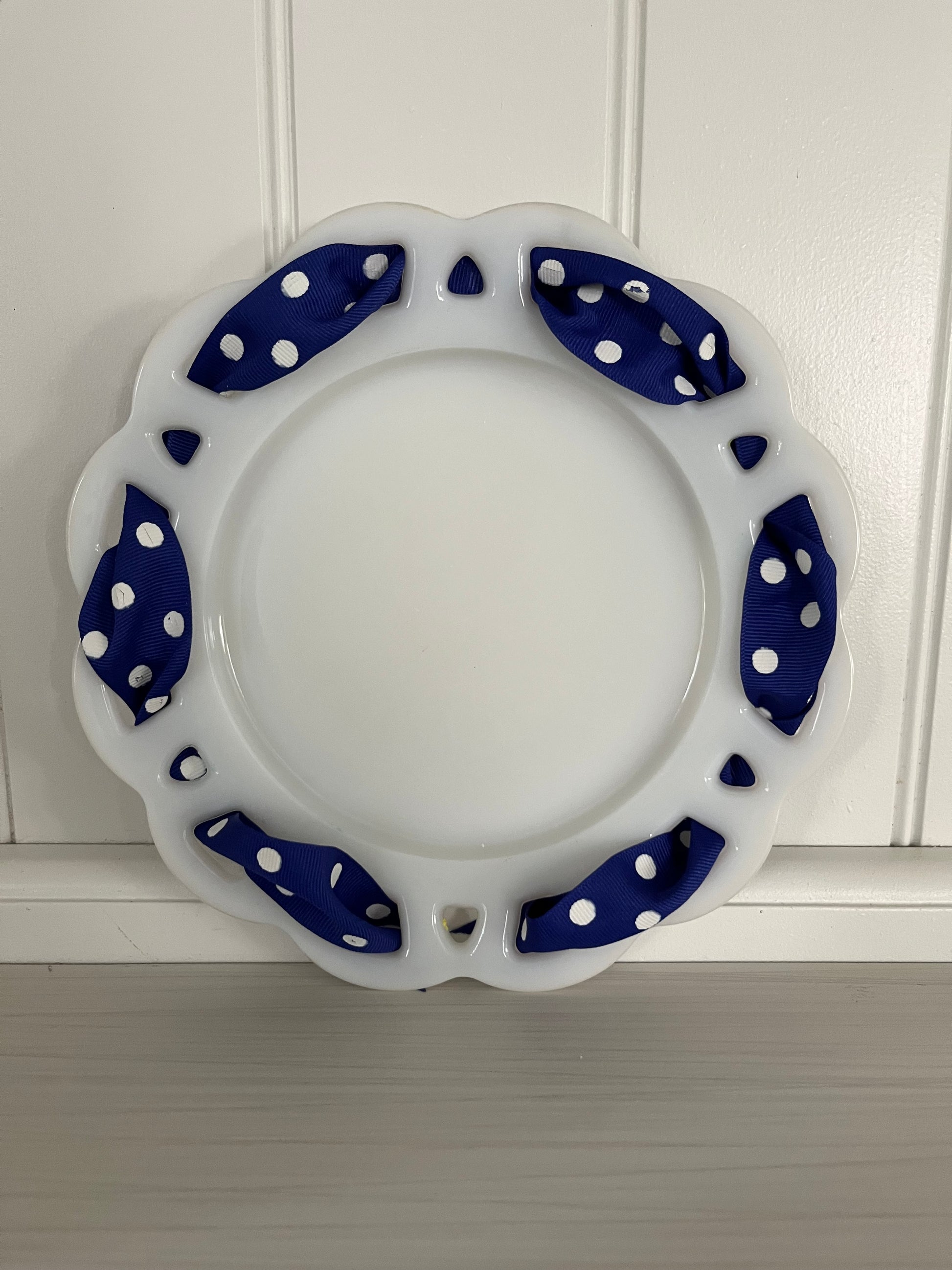 Styled here with a blue polka-dot ribbon threaded through the lace openings, this plate is a true statement in cottagecore and farmhouse dining. Whether used as a dessert plate, vanity tray, or decorative wall hanger, it embodies the quiet elegance of mid-century milk glass design.