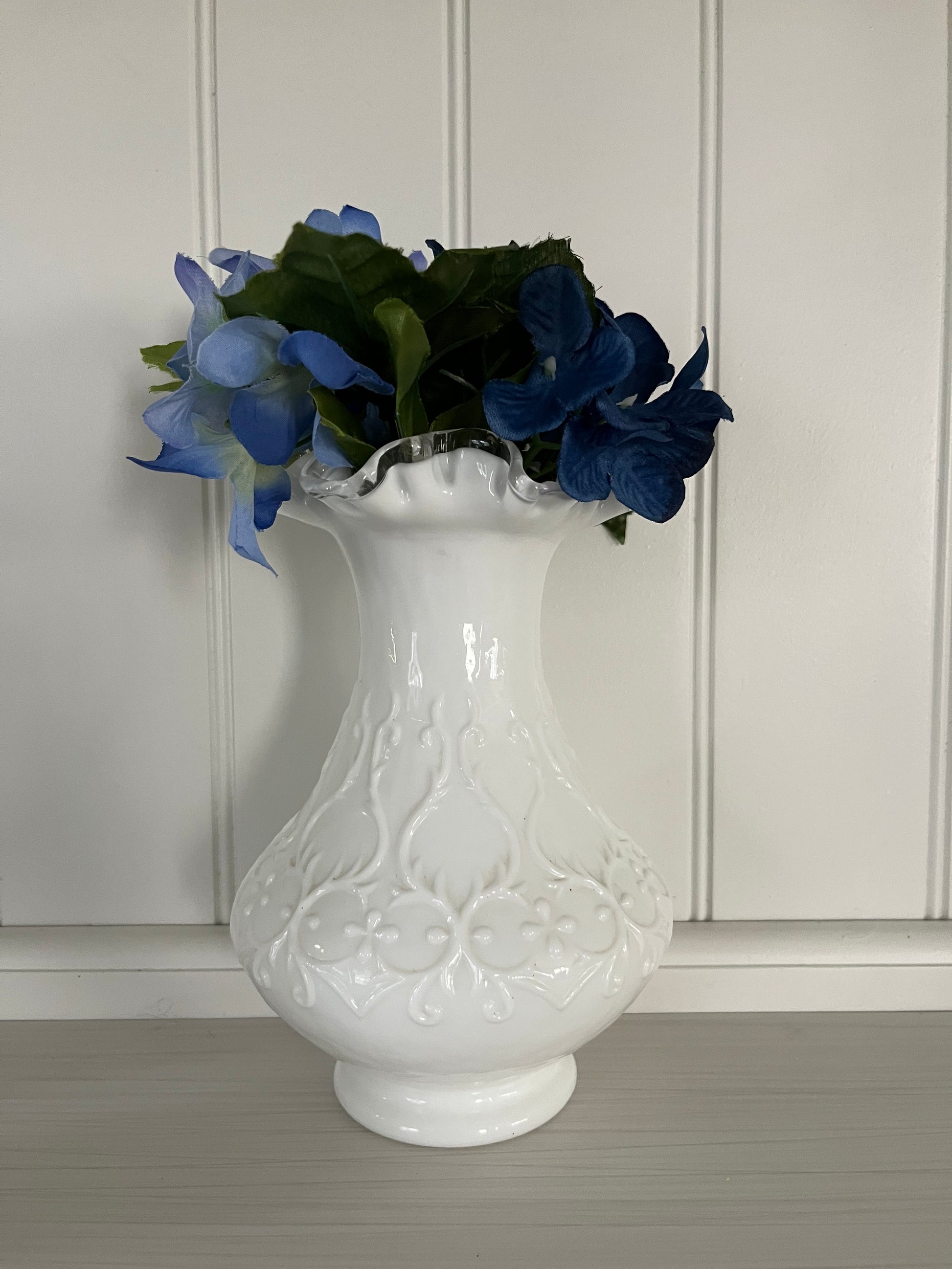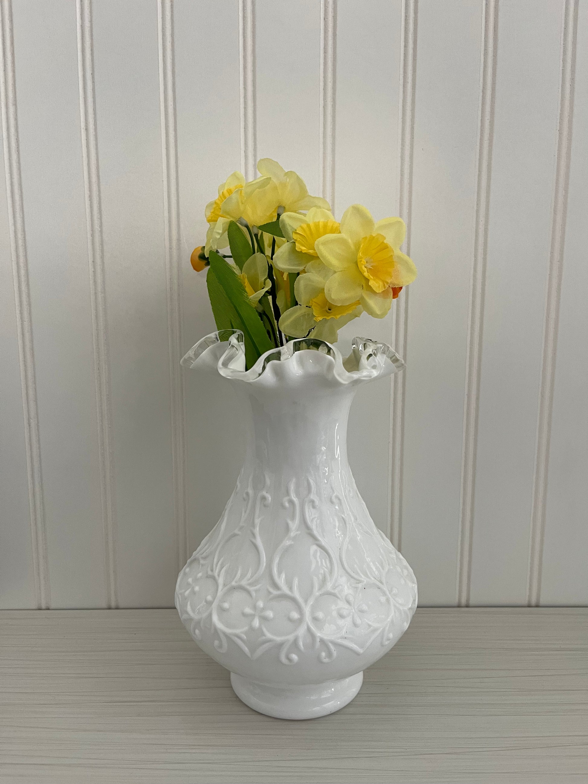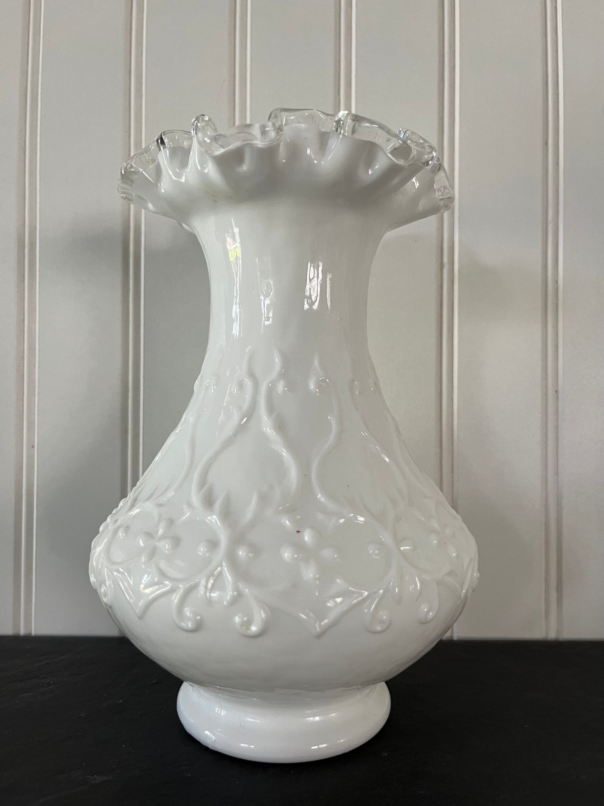 Elevate your decor with the elegance of the 1950s with this captivating Fenton milk glass vase. Don't miss the opportunity to own a piece of vintage glass history that adds both beauty and character to your home.