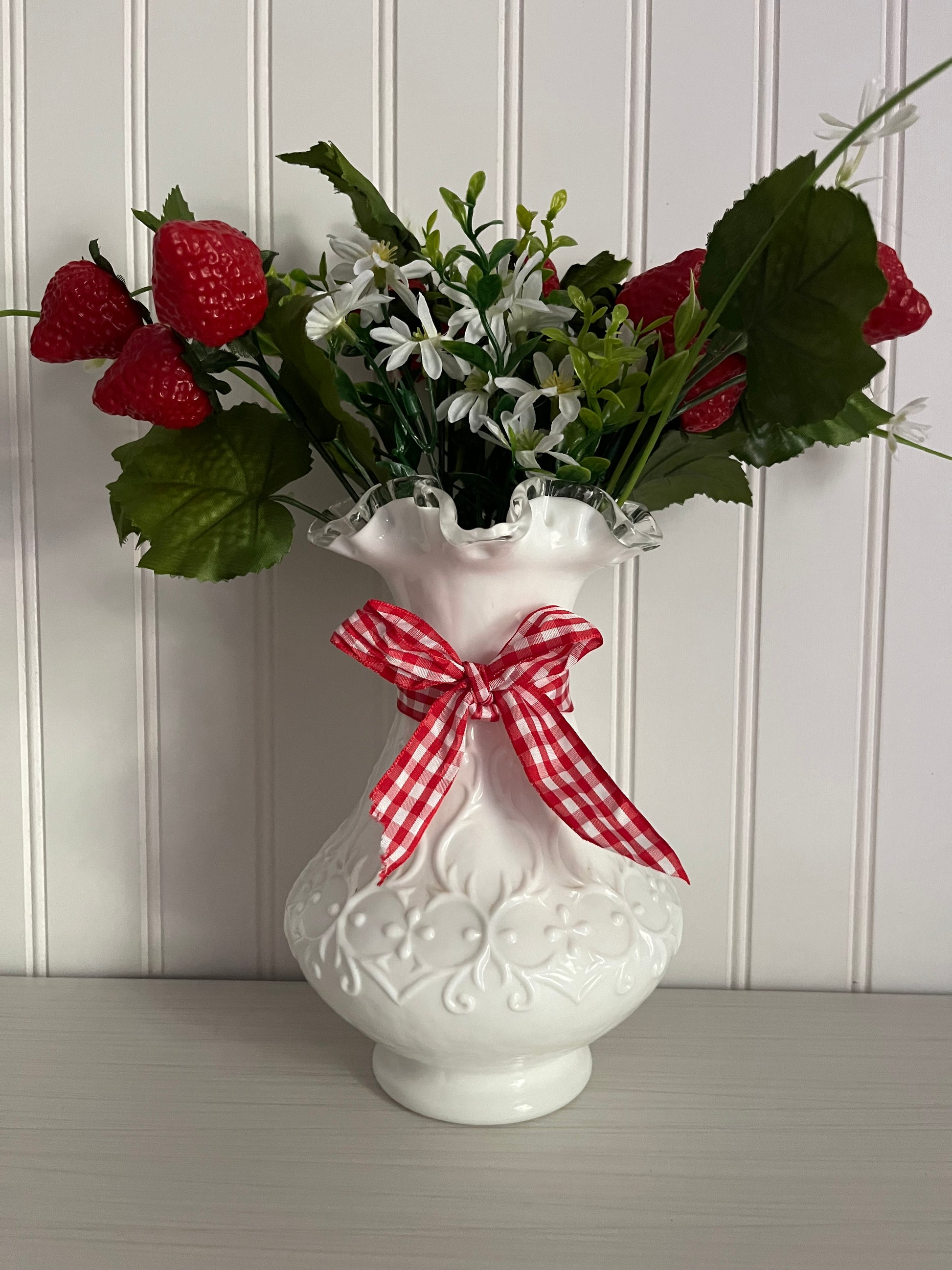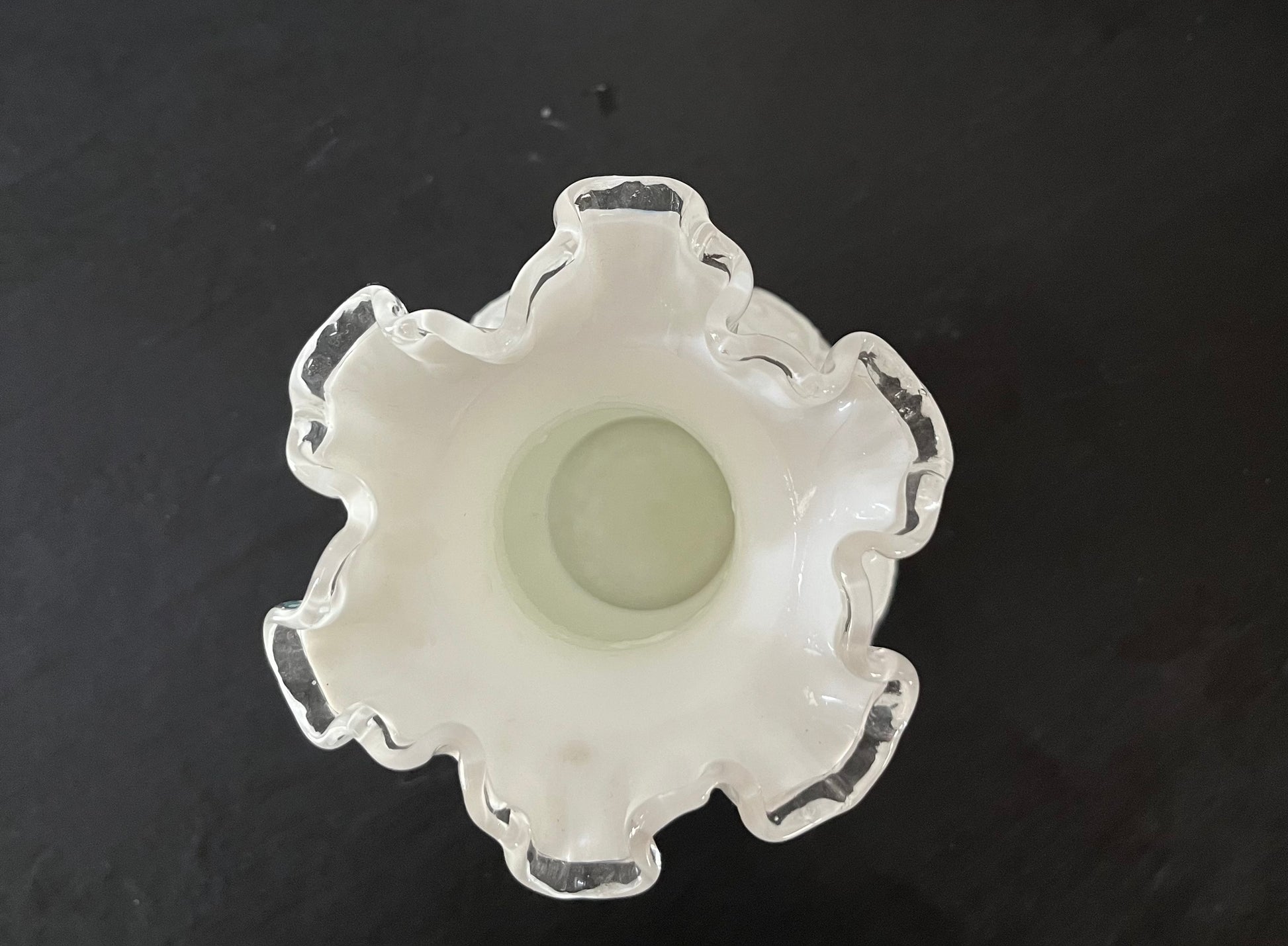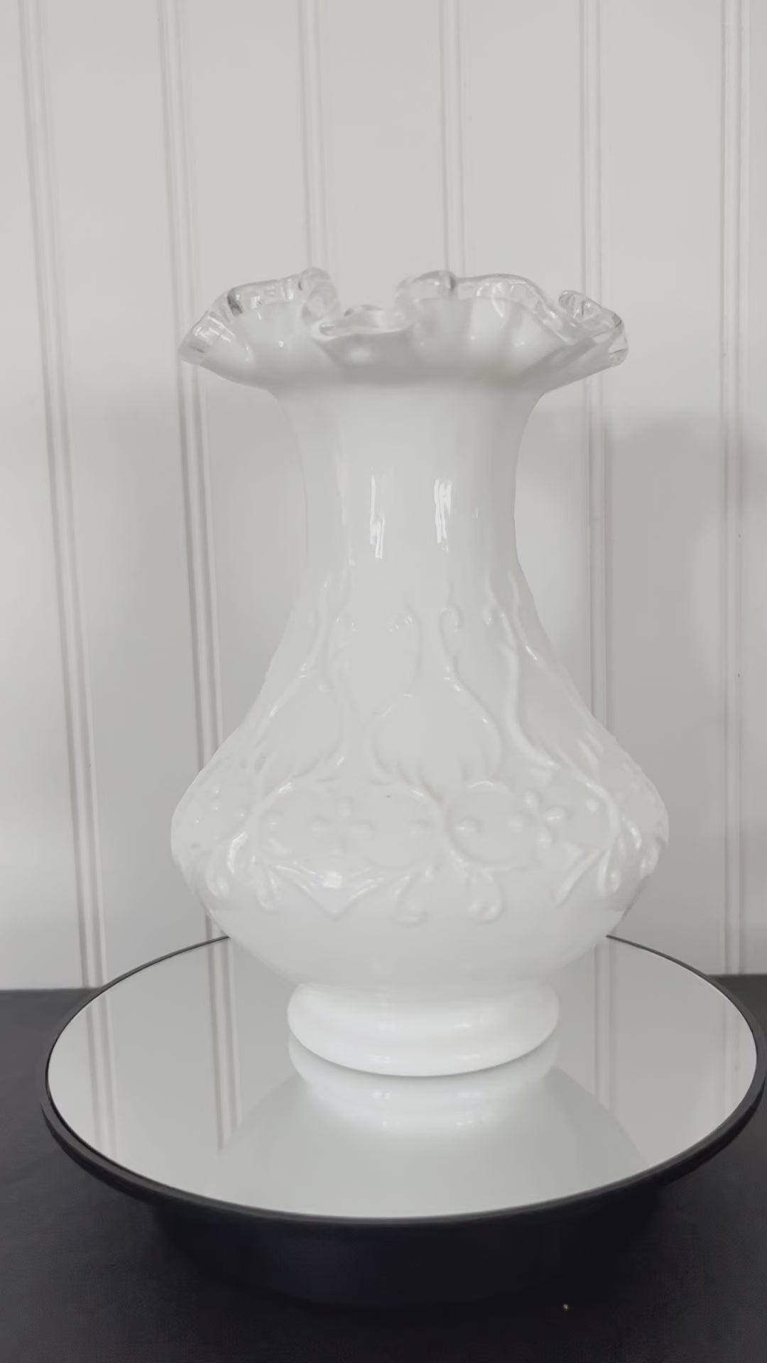 Elevate your decor with the elegance of the 1950s with this captivating Fenton milk glass vase. Don't miss the opportunity to own a piece of vintage glass history that adds both beauty and character to your home.