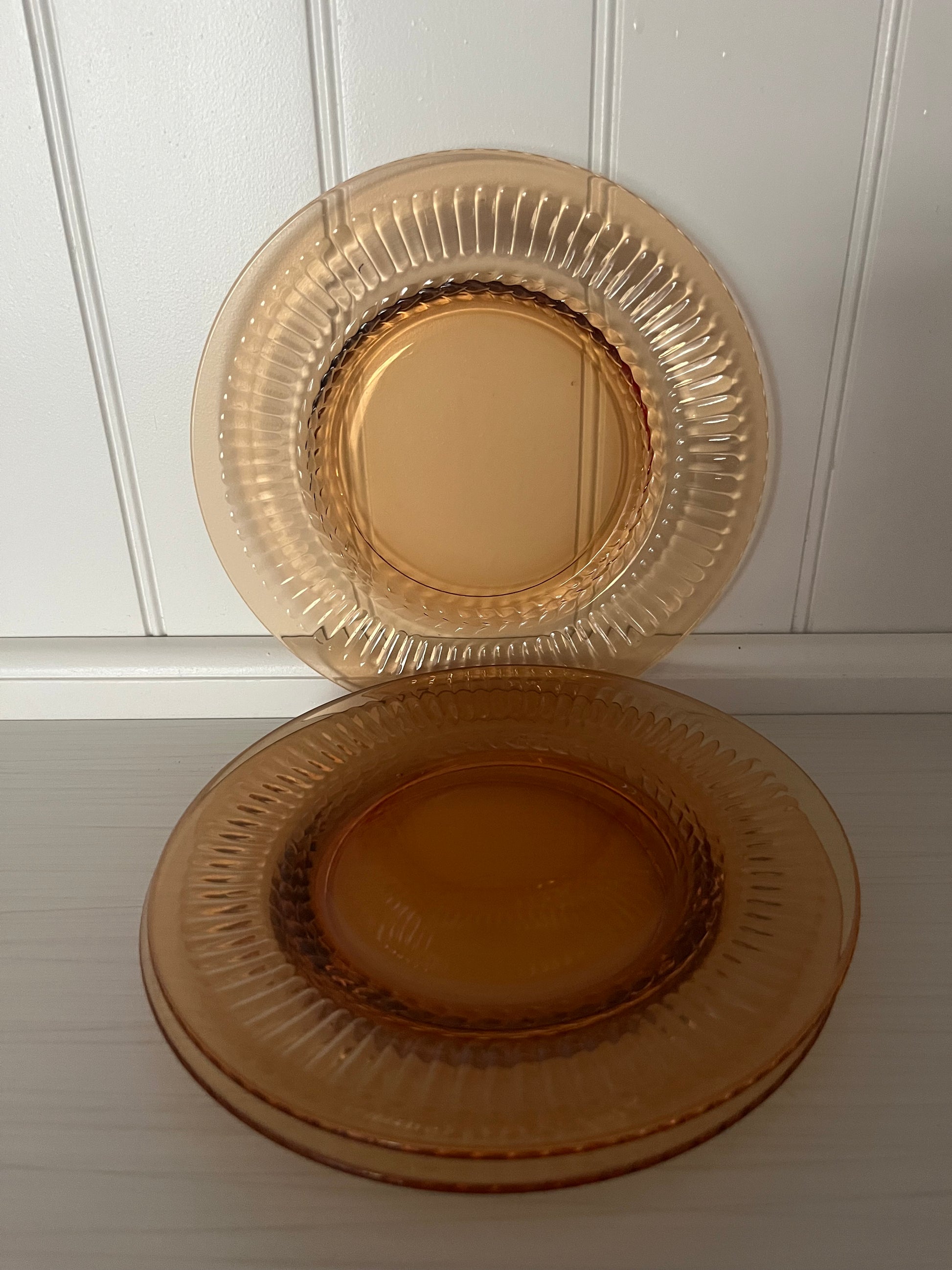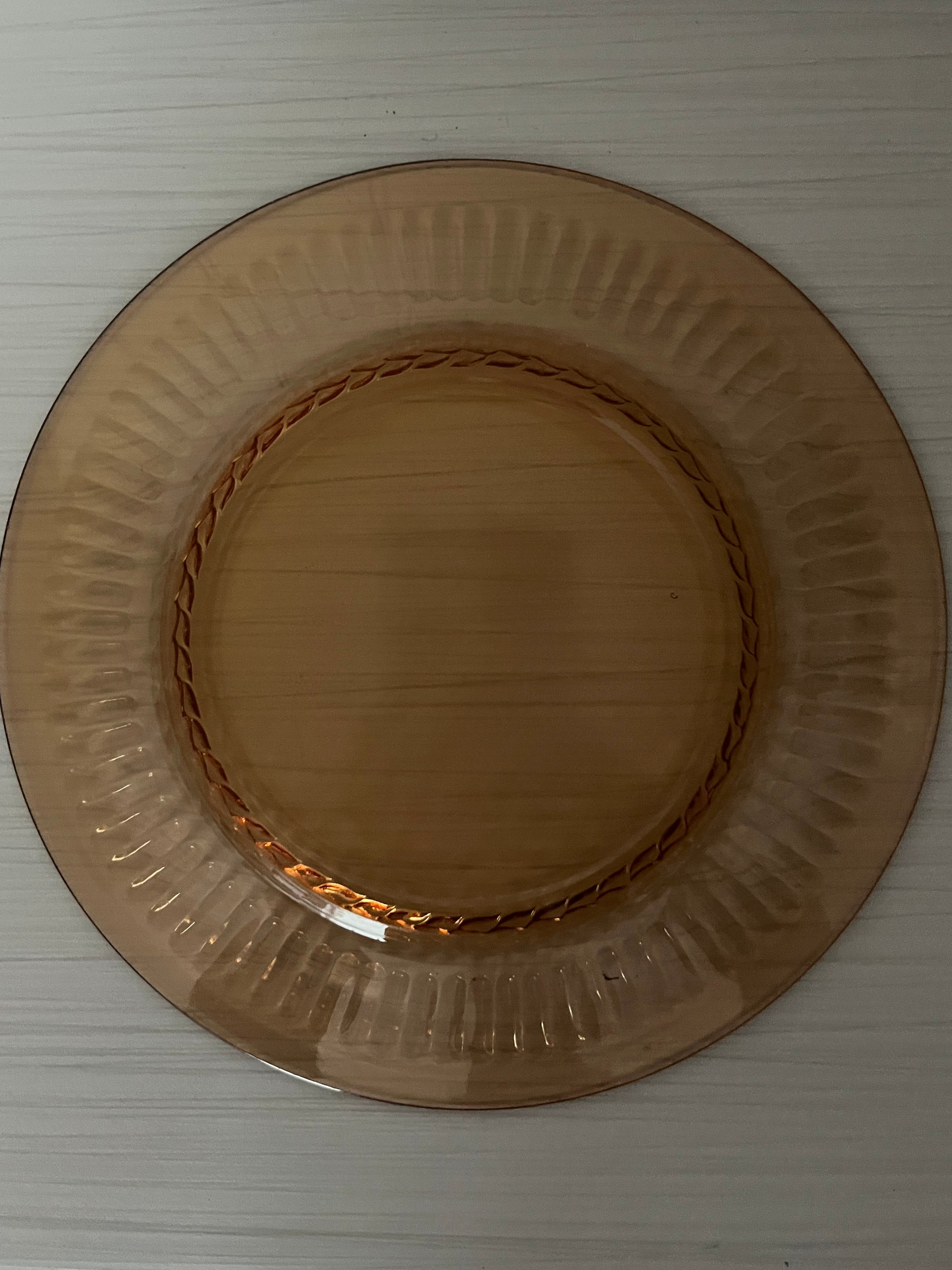 Amber glass surged in popularity throughout the 1960s–1970s, prized for its warmth, durability, and ability to elevate everyday dining with a golden glow. Often produced by American glassmakers during the mid-century era, amber dinnerware bridged the gap between practical use and decorative beauty. Fluted rims and braided motifs were especially popular, echoing classical design elements while remaining approachable for everyday homes.