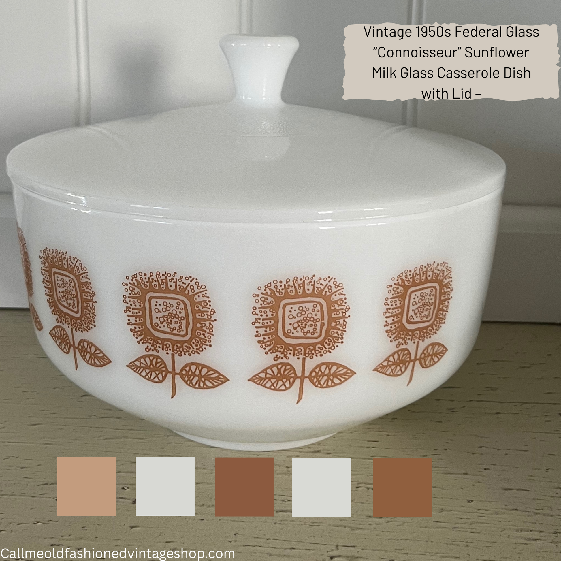 Vintage 1950s Federal Glass “Connoisseur” Sunflower Milk Glass Casserole Dish with Lid – Mid-Century Modern Charm