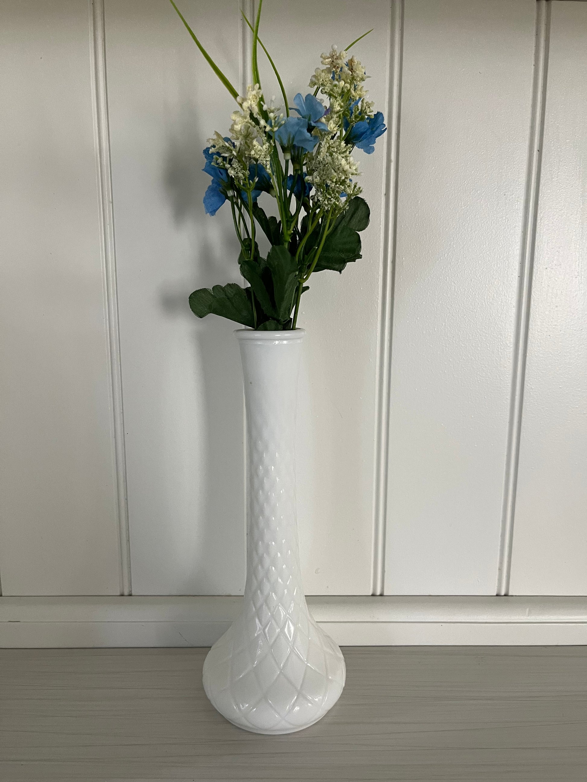 Add timeless charm to your home with this vintage milk glass bud vase, measuring 9.5” tall with a diamond quilted pattern that gently tapers from a wide base to a narrow mouth. Its smooth glossy finish reflects light beautifully, making it an elegant accent for mantels, dining tables, or cottagecore displays.