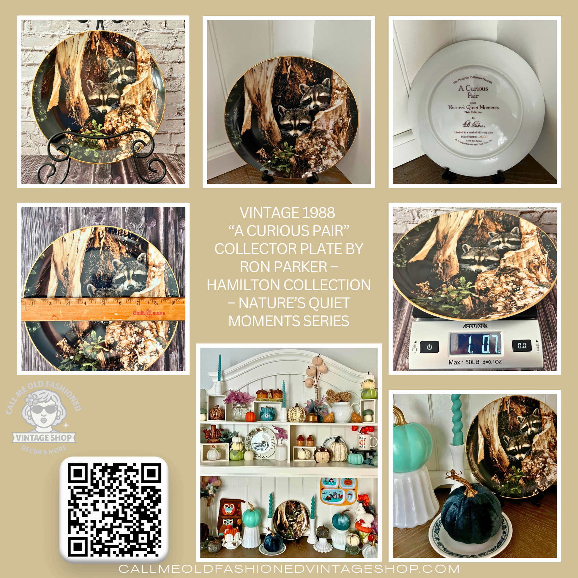 Bring a touch of woodland serenity to your fall cottage décor with “A Curious Pair” from artist Ron Parker’s Nature’s Quiet Moments plate collection. Produced in 1988 by The Hamilton Collection, this limited-edition porcelain plate captures two curious raccoons peeking from their forest hollow—rich in lifelike detail and framed with a shimmering 22k gold rim. A perfect piece for wildlife collectors or rustic woodland vignettes, it adds warmth and nostalgia to any display shelf or cabin wall.