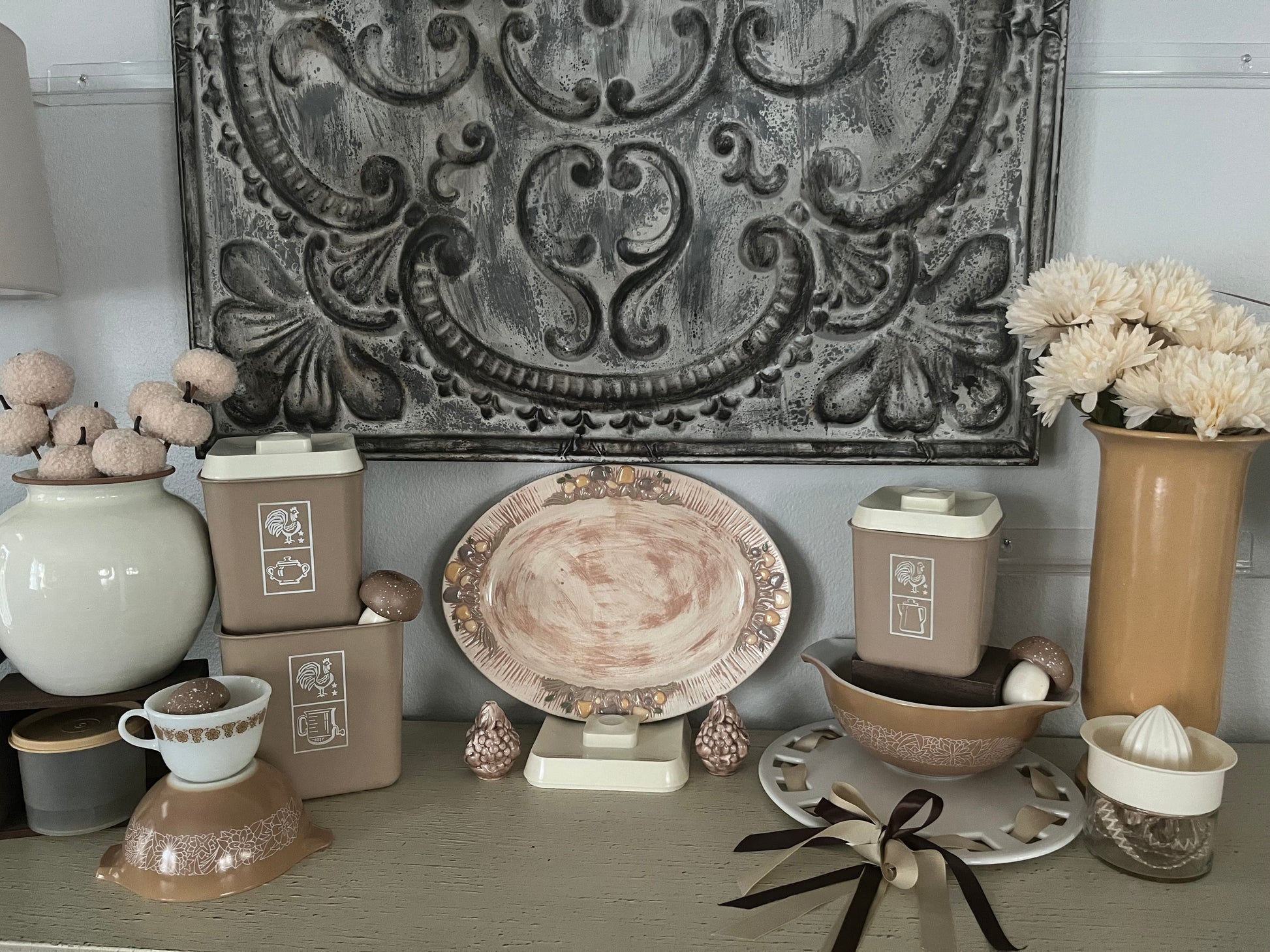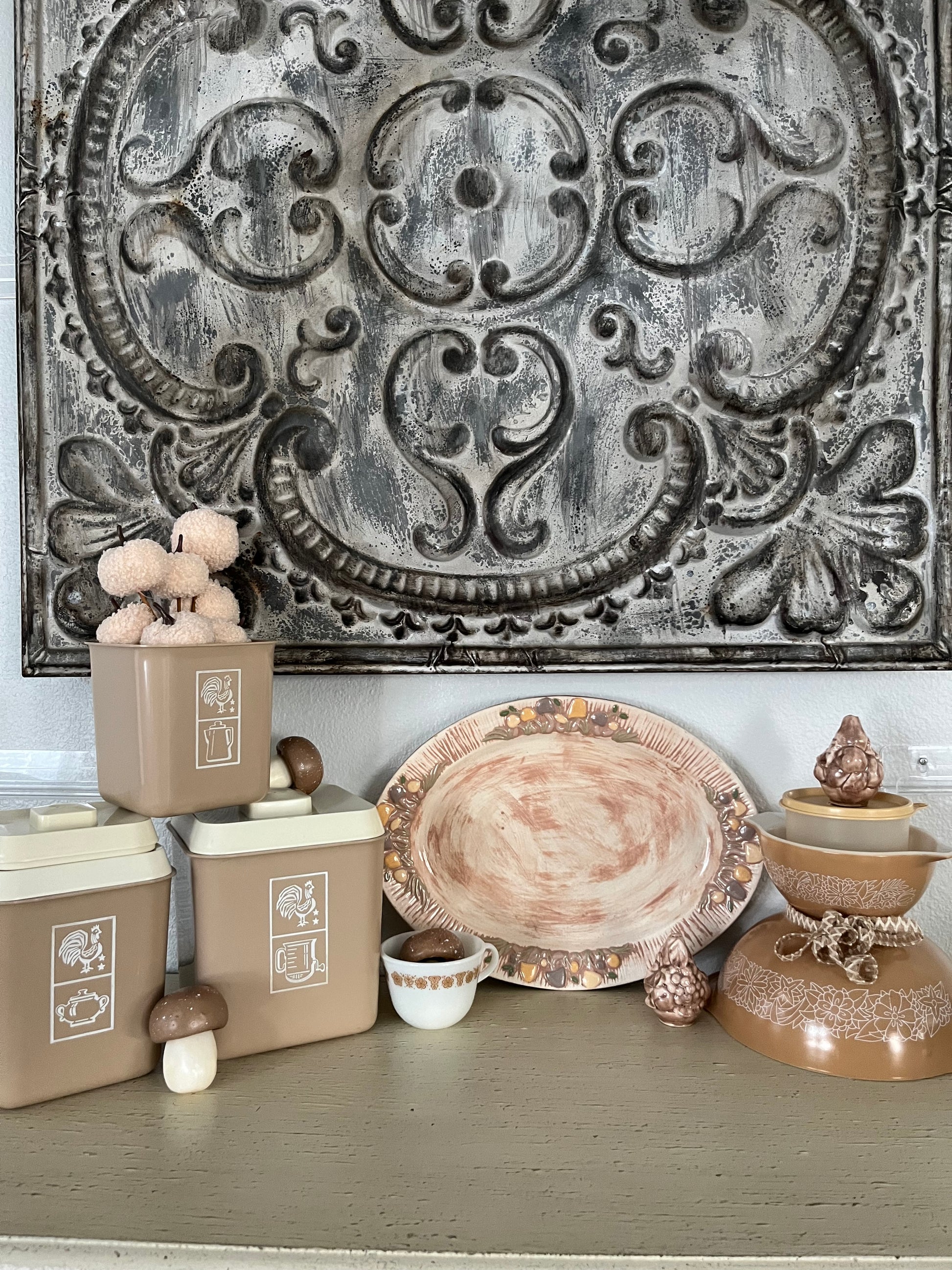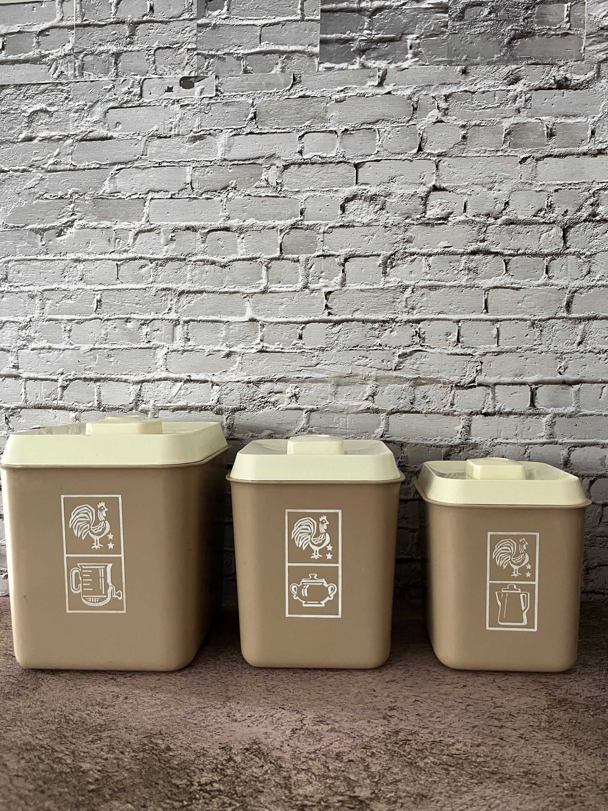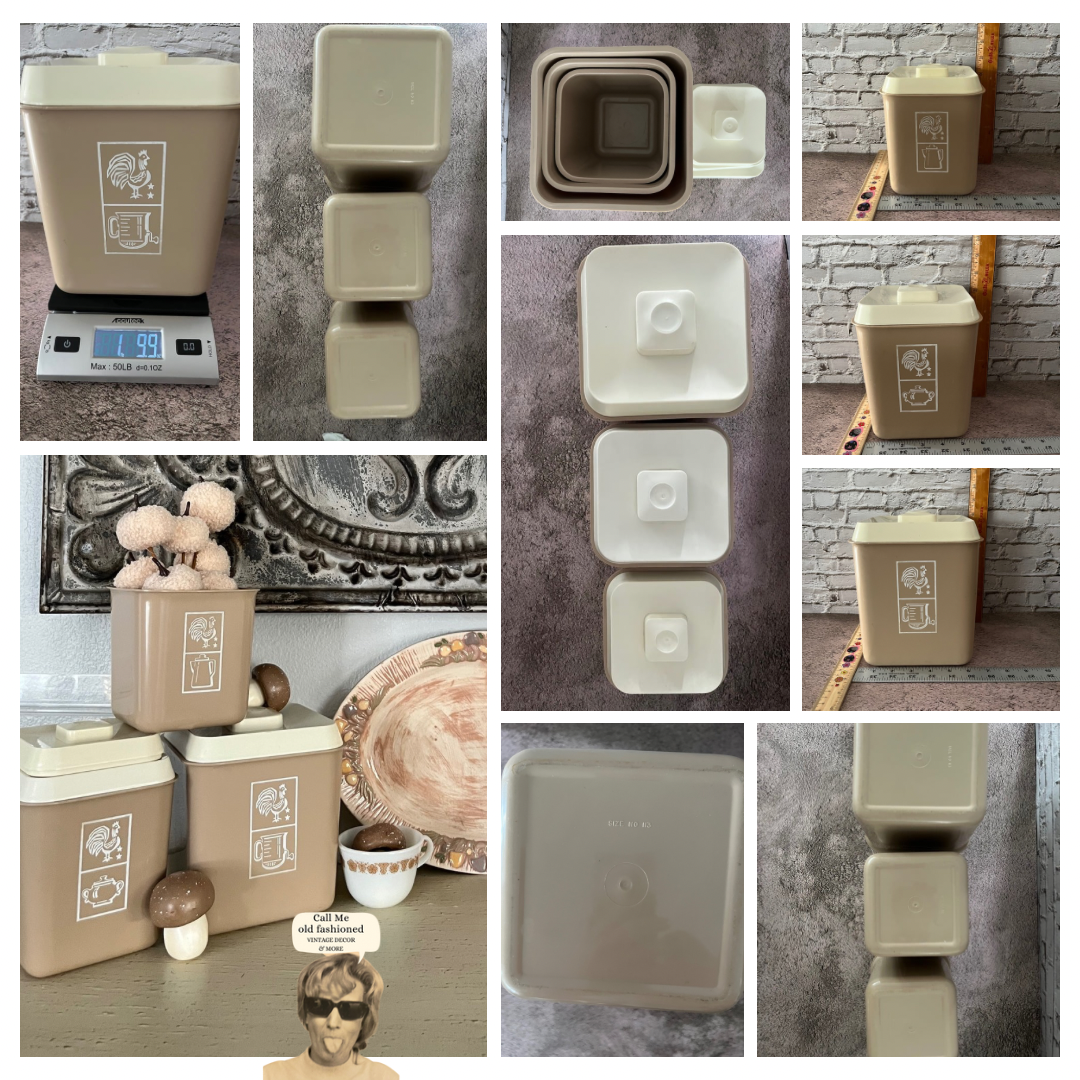 Vintage 1960’s Beige Brown Plastic Kitchen Canister Set (3) | Lustro Ware | Woodland Whimsy MCM Retro Rooster Design