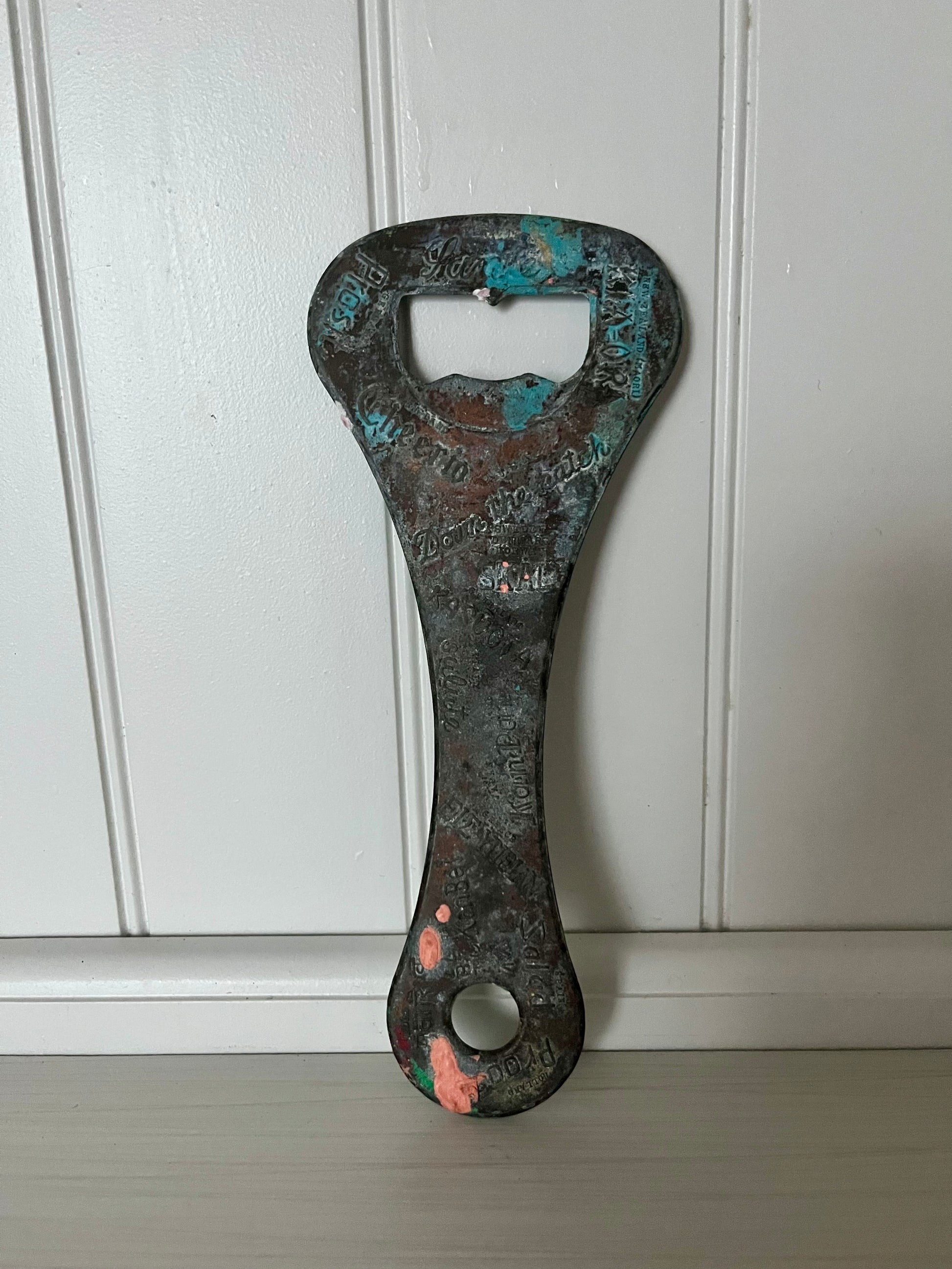Wall-mount bottle openers like this gained popularity through the 1950s–1970s in European pubs and American bars, often produced as souvenirs by breweries or foundries. The multilingual toast engravings mirror post-war travel optimism—celebrating camaraderie across borders. Cast-iron versions were prized for durability, making them both collectible and functional relics of mid-century leisure life.