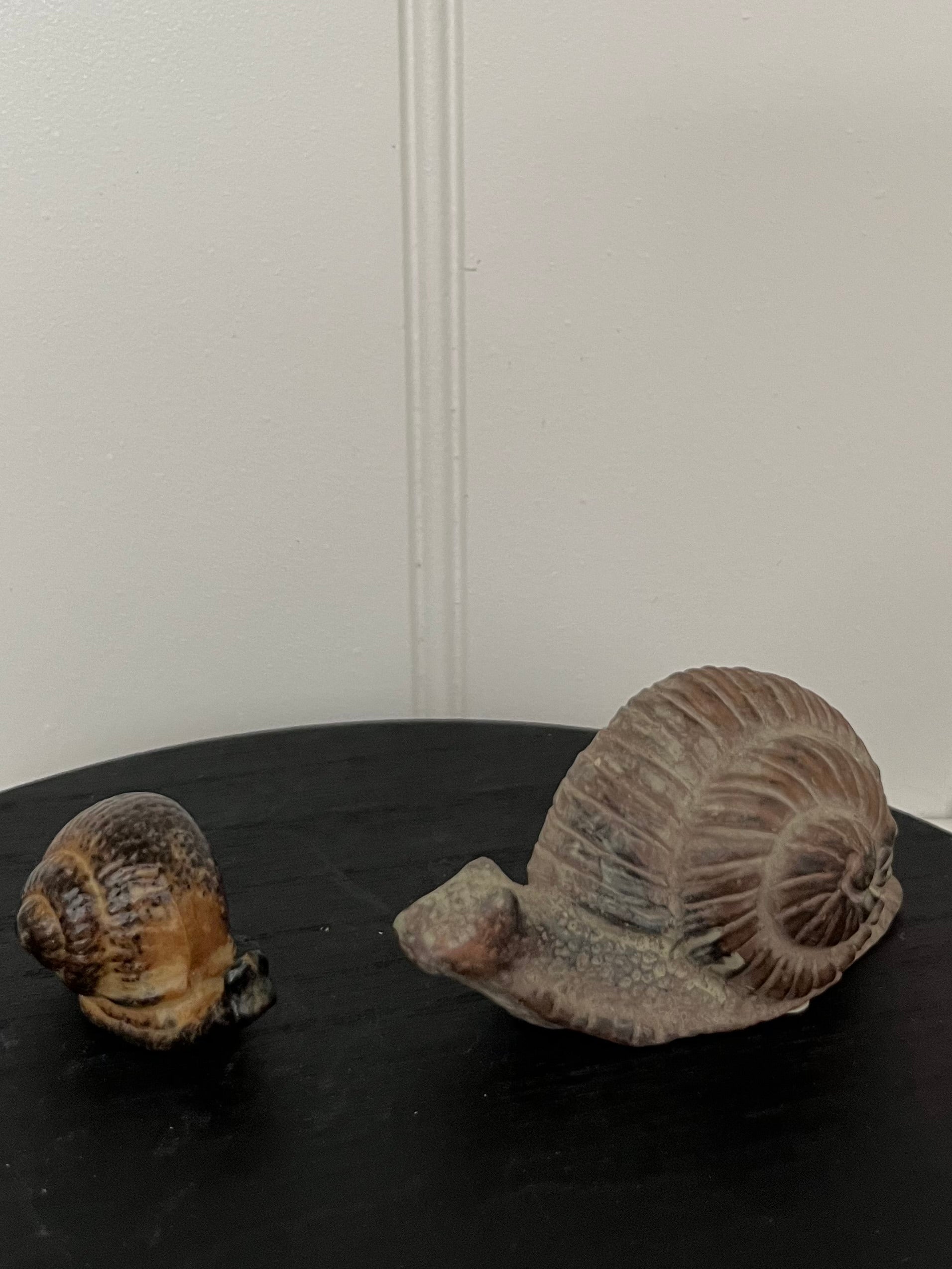 Charming pair of vintage ceramic snails featuring hand-painted earthy brown and mossy green glazes with natural texturing and realistic shell ridges. Each piece is crafted with lovely variation in tone and surface detail, evoking the tranquil beauty of a garden scene. The pair displays wonderfully together — the larger snail with matte rustic finish contrasts beautifully with the smaller glossy brown one.