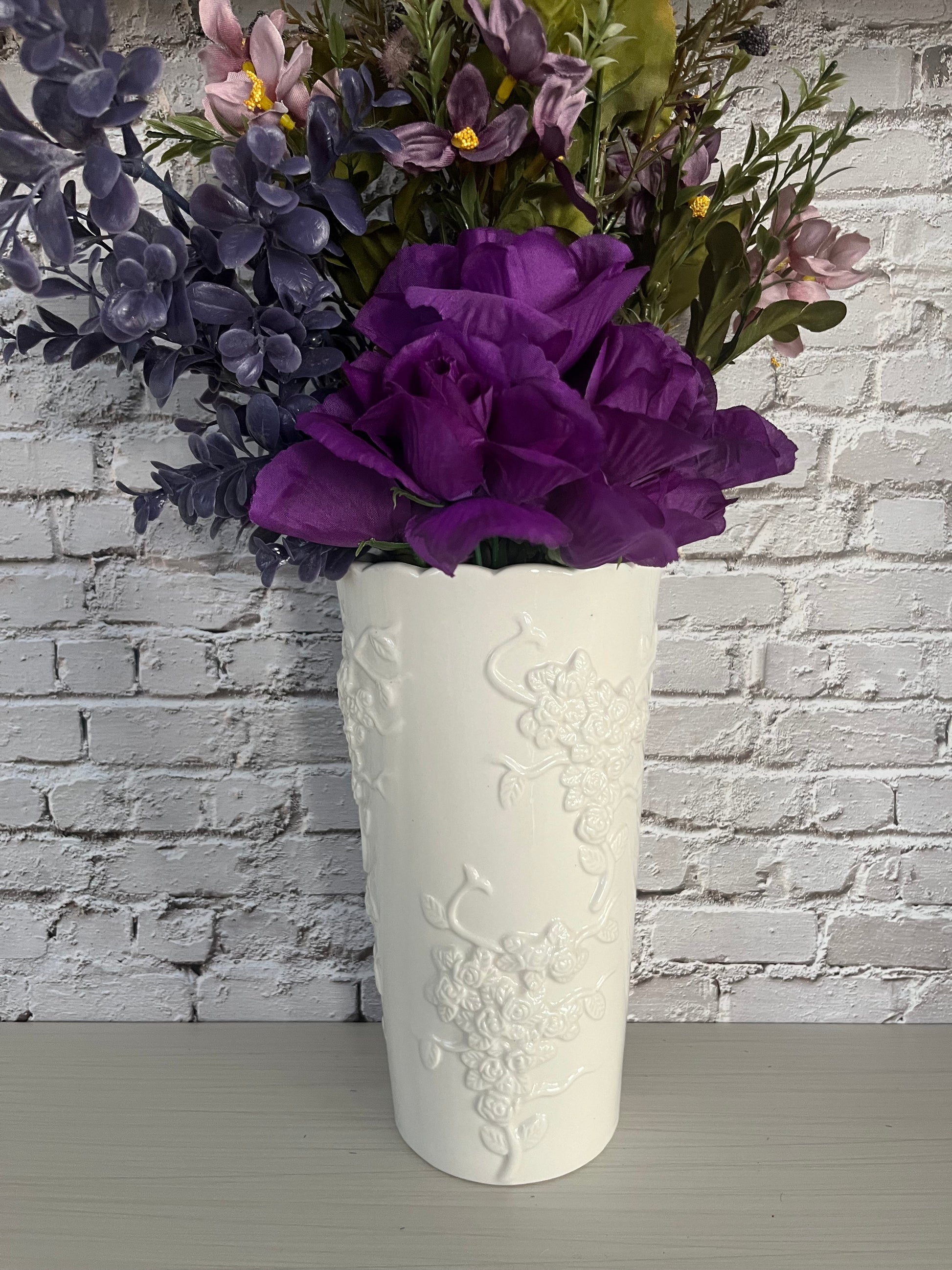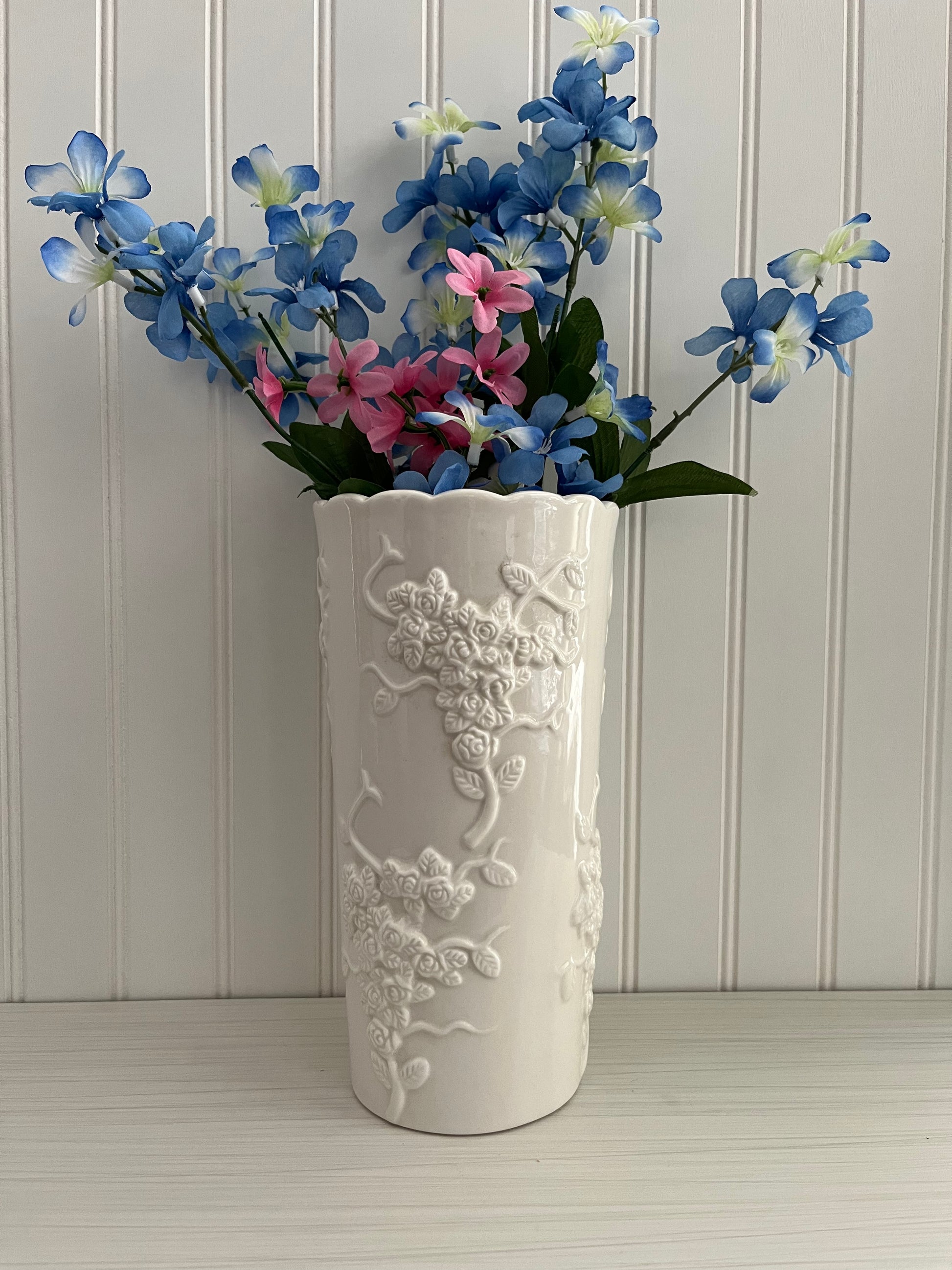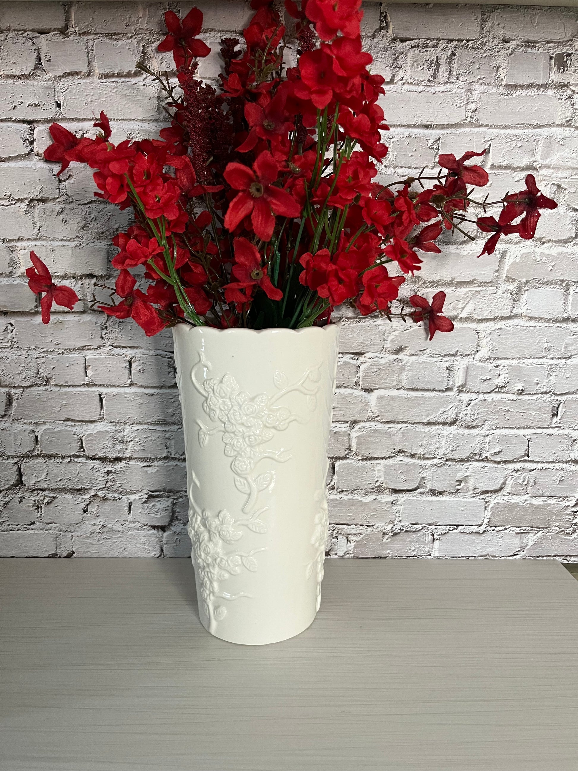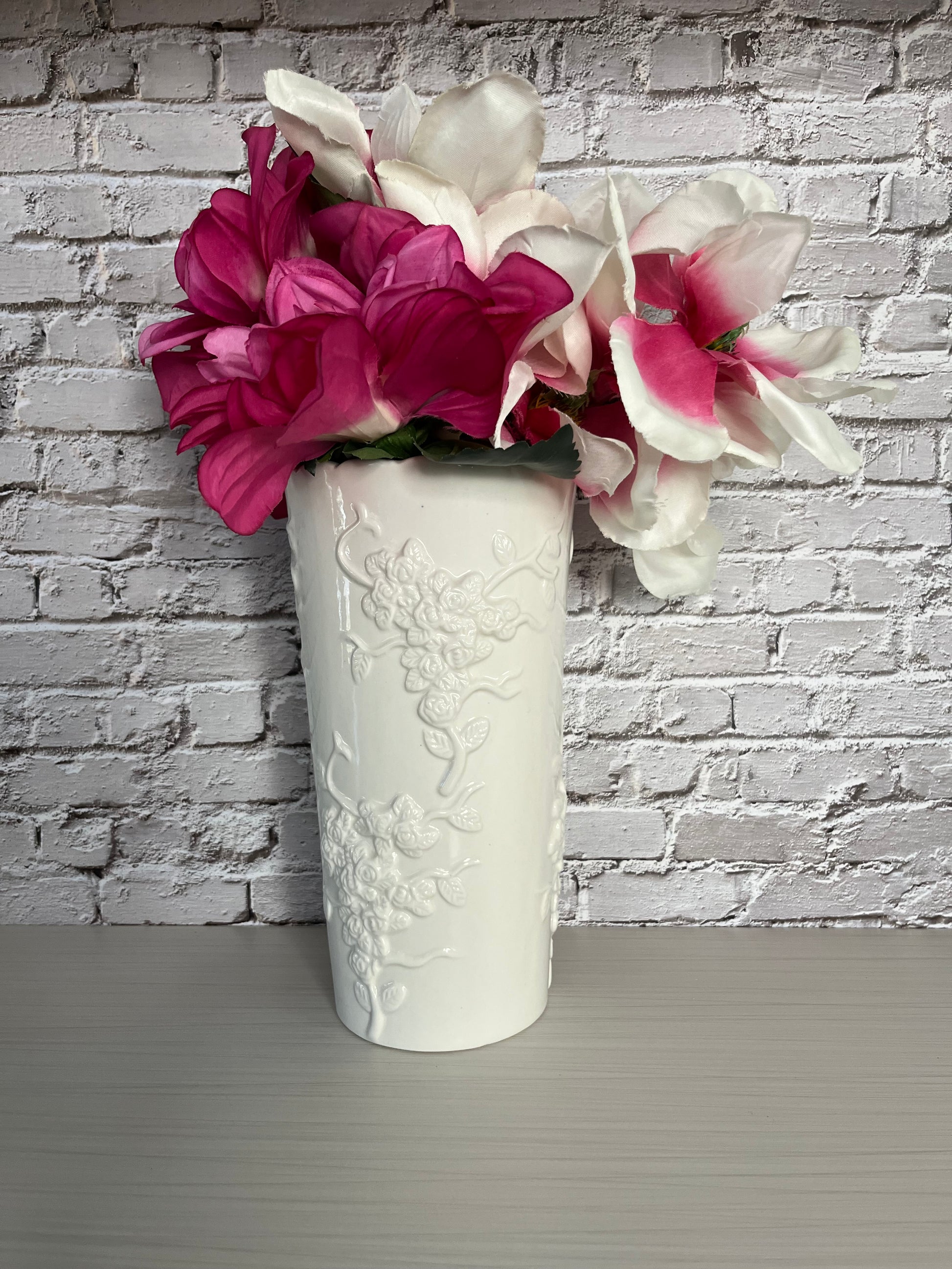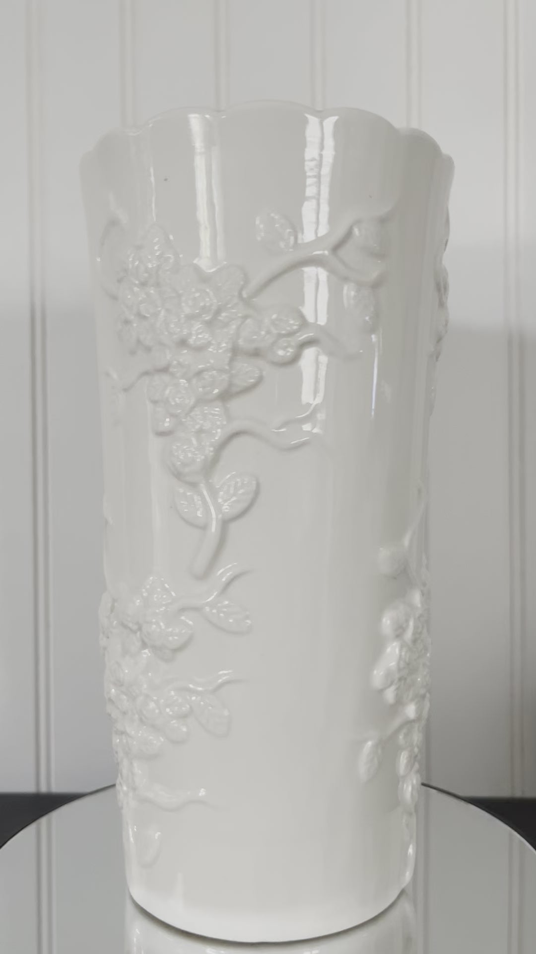 Vintage Rose Vine Embossed White Ceramic Scalloped Top Vase - 9.5" Height - 4.5" Diameter - Classic Elegance