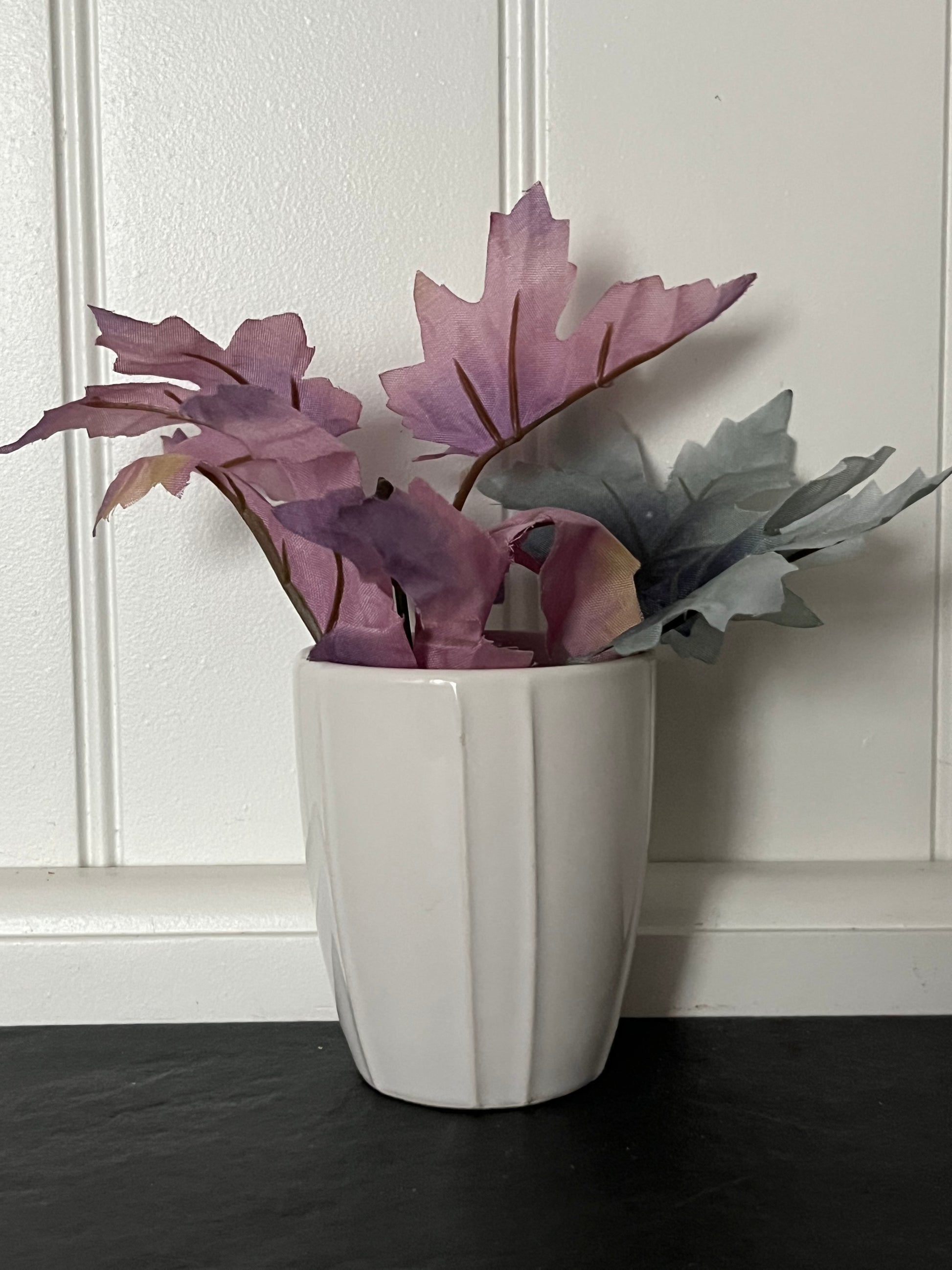 This elegant vintage white ceramic tumbler features a vertically fluted body with a softly tapered form, creating a minimalist silhouette that captures mid-century modern design at its best. Its glossy glaze highlights the vertical ridges, while the solid weight (4.9 oz) gives it a sturdy, handmade feel. Measuring approximately 3.25″ tall × 2.25″ wide, it’s perfectly sized for holding small floral buds, makeup brushes, or even used as a petite desk organizer. Its timeless simplicity makes it a versatile accent for both vintage and contemporary décor.