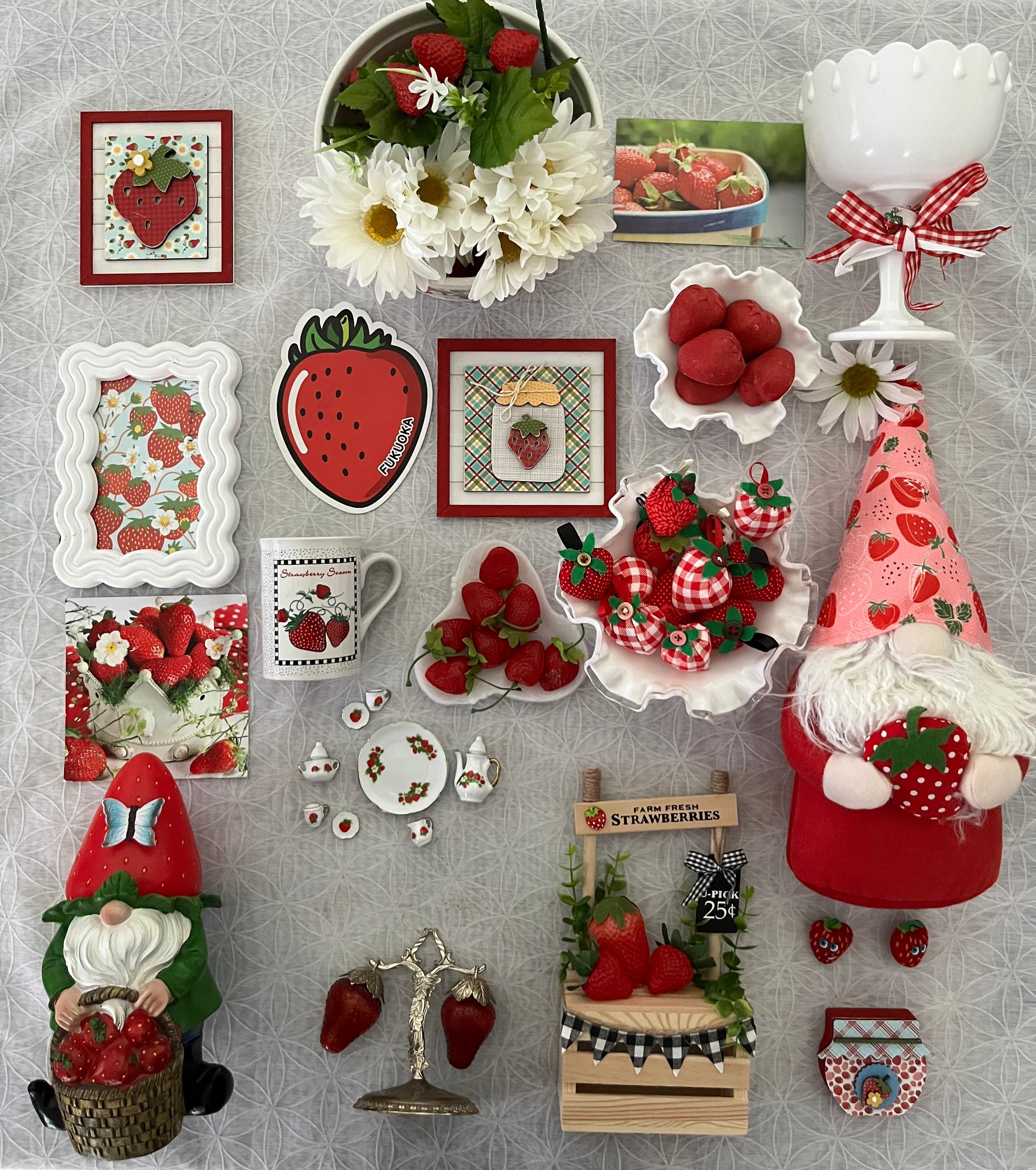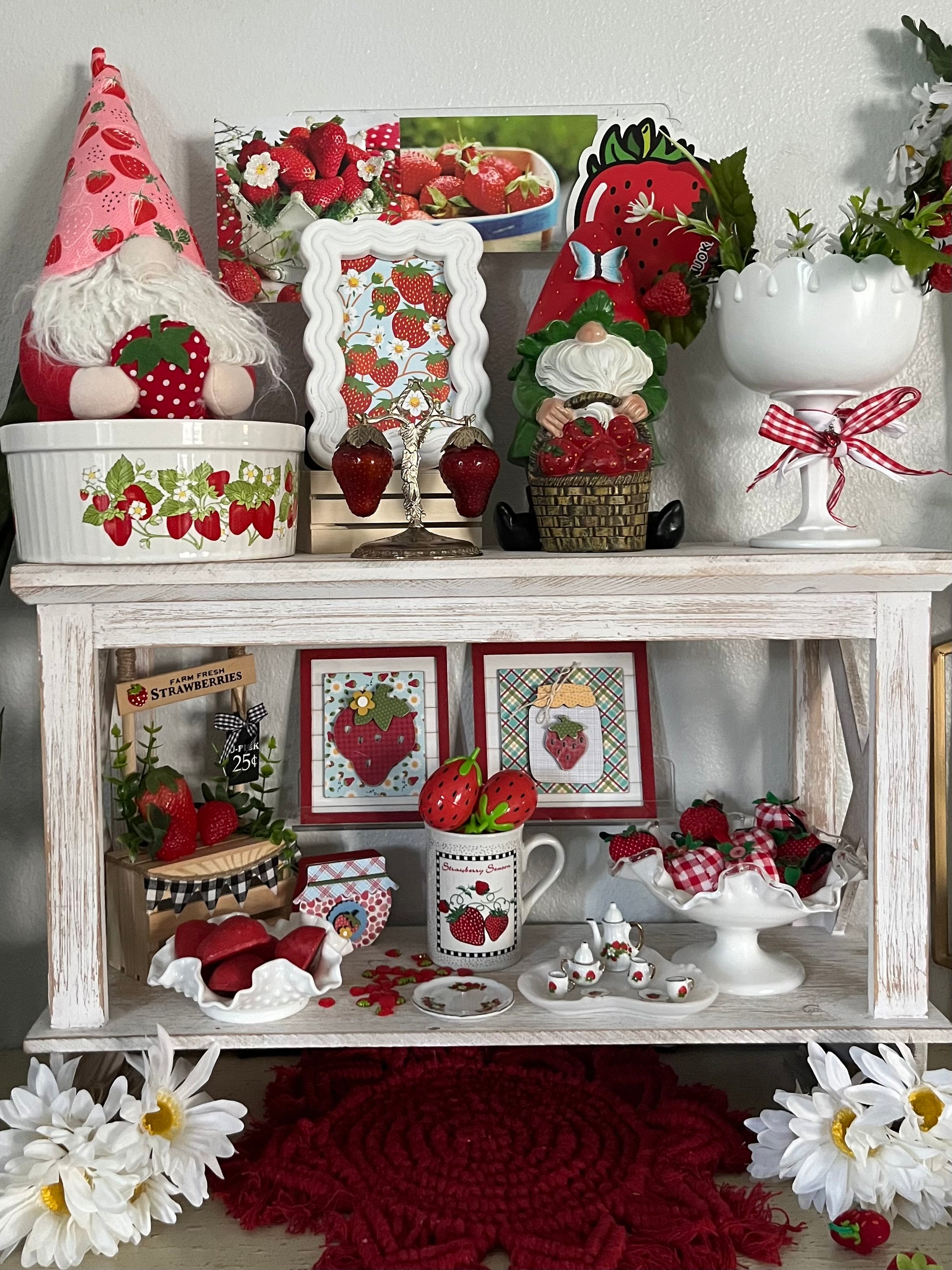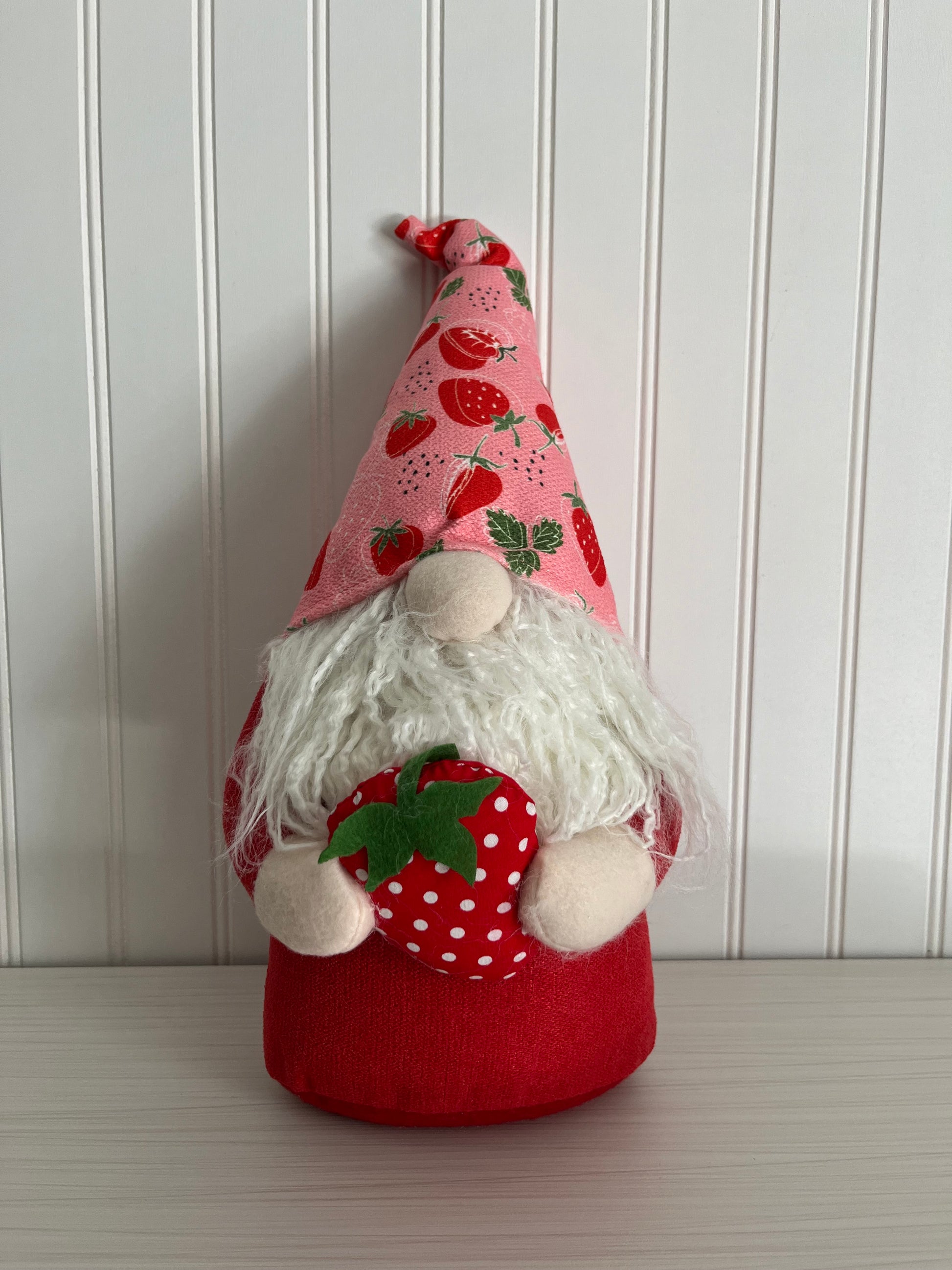 Whimsical Fabric Gnome with Strawberry Hat and Strawberry Fruit - Summer Table Décor - 16.5” Height
